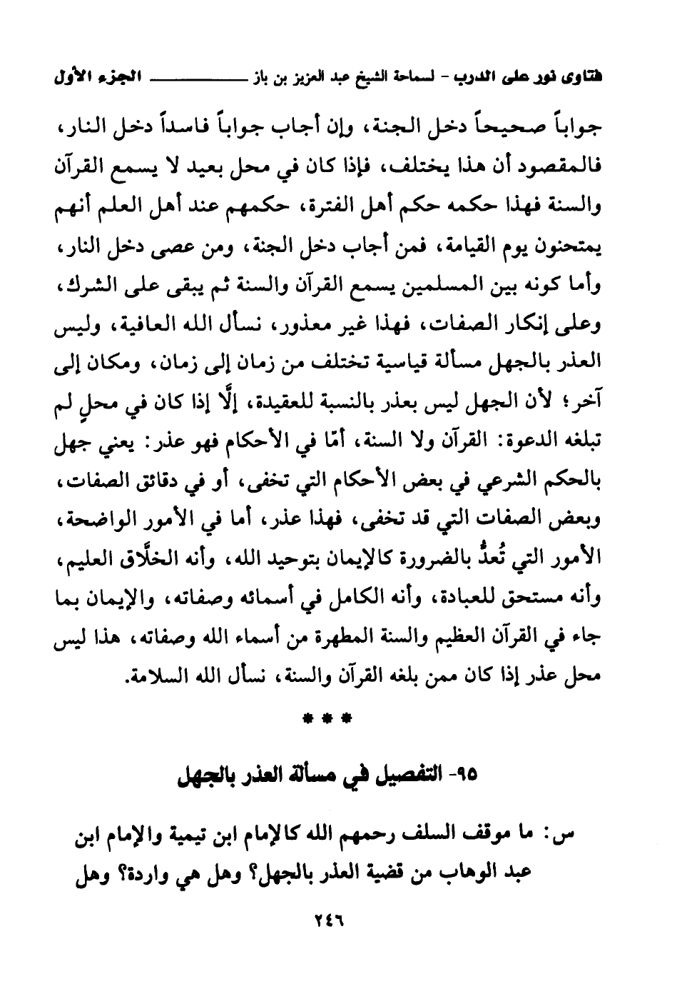 جوابا صحيحا دخل الجنة وإن أجاب جوابا فاسدا دخل النار، فالمقصود أن هذا يختلف فإذا كان في محل بعيد لا يسمع القرآن والسنة فهذا حكمه حكم أهل الفترة، حكمهم عند أهل العلم أنهم يمتحنون يوم القيامة، فمن أجاب دخل الجنة ومن عصى دخل النار، وأما كونه بين المسلمين يسمع القرآن والسنة ثم يبقى على الشرك وعلى إنكار الصفات فهو غير معذور، نسأل الله العافية، وليس العذر بالجهل مسألة قياسية تختلف من زمان إلى زمان ومكان إلى آخر؛ لأن الجهل ليس بعذر بالنسبة للعقيدة، إلا إذا كان في محل لم تبلغه الدعوة: القرآن ولا السنة، أما في الأحكام فهو عذر: يعني جهل بالحكم الشرعي في بعض الأحكام التي تخفى، أو في دقائق الصفات، وبعض الصفات التي قد تخفى فهذا عذر، أما في الأمور الواضحة، الأمور التي تعد بالضرورة كالإيمان بتوحيد الله، وأنه الخلاق العليم، وأنه مستحق للعبادة، وأنه الكامل في أسمائه وصفاته، والإيمان بما جاء في القرآن العظيم والسنة المطهرة من أسماء الله وصفاته، هذا ليس محل عذر إذا كان ممن بلغه القرآن والسنة، نسأل الله السلامة.