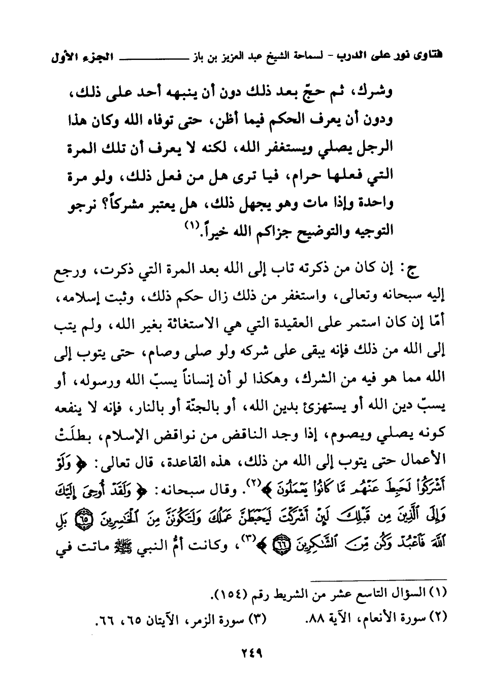 ج: إن كان من ذكرته تاب إلى الله بعد المرة التي ذكرت، ورجع إليه سبحانه وتعالى، واستغفر من ذلك زال حكم ذلك، وثبت إسلامه، أما إن كان استمر على العقيدة التي هي الاستغاثة بغير الله، ولم يتب إلى الله من ذلك فإنه يبقى على شركه ولو صلى وصام، حتى يتوب إلى الله مما هو فيه من الشرك، وهكذا لو أن إنسانا يسب الله ورسوله، أو يسب دين الله أو يستهزئ بدين الله، أو بالجنة أو بالنار، في أنه لا ينفعه كونه يصلي ويصوم، إذا وجد الناقض من نواقض الإسلام، بطلت الأعمال حتى يتوب إلى الله من ذلك، هذه القاعدة، قال تعالى: {وَلَوْ أَشْرَكُوا لَحَبِطَ عَنْهُمْ مَا كَانُوا يَعْمَلُونَ} (¬2)، وقال سبحانه: {وَلَقَدْ أُوحِيَ إِلَيْكَ وَإِلَى الَّذِينَ مِنْ قَبْلِكَ لَئِنْ أَشْرَكْتَ لَيَحْبَطَنَّ عَمَلُكَ وَلَتَكُونَنَّ مِنَ الْخَاسِرِينَ} (¬3) {بَلِ اللَّهَ فَاعْبُدْ وَكُنْ مِنَ الشَّاكِرِينَ} (¬4)، وكانت أم النبي صلى الله عليه وسلم ماتت في