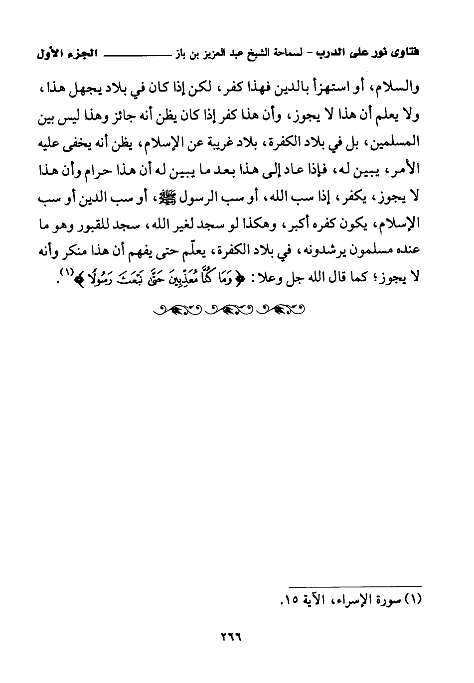 والسلام، أو استهزأ بالدين فهذا كفر، لكن إذا كان في بلاد يجهل هذا، ولا يعلم أن هذا لا يجوز؛ وأن هذا كفر إذا كان يظن أنه جائز وهذا ليس بين المسلمين، بل في بلاد الكفرة، بلاد غريبة عن الإسلام؛ يظن أنه يخفى عليه الأمر؛ يبين له؛ فإذا عاد إلى هذا بعد ما يبين له أن هذا حرام وأن هذا لا يجوز، يكفر؛ إذا سب الله؛ أو سب الرسول صلى الله عليه وسلم أو سب الدين أو سب الإسلام، يكون كفره أكبر، وهكذا لو سجد لغير الله، سجد للقبور وهو ما عنده مسلمون يرشدونه، في بلاد الكفرة، يعلم حتى يفهم أن هذا منكر وأنه لا يجوز؛ كما قال الله جل وعلا: {وَمَا كُنَّا مُعَذِّبِينَ حَتَّى نَبْعَثَ رَسُولًا} (¬1).