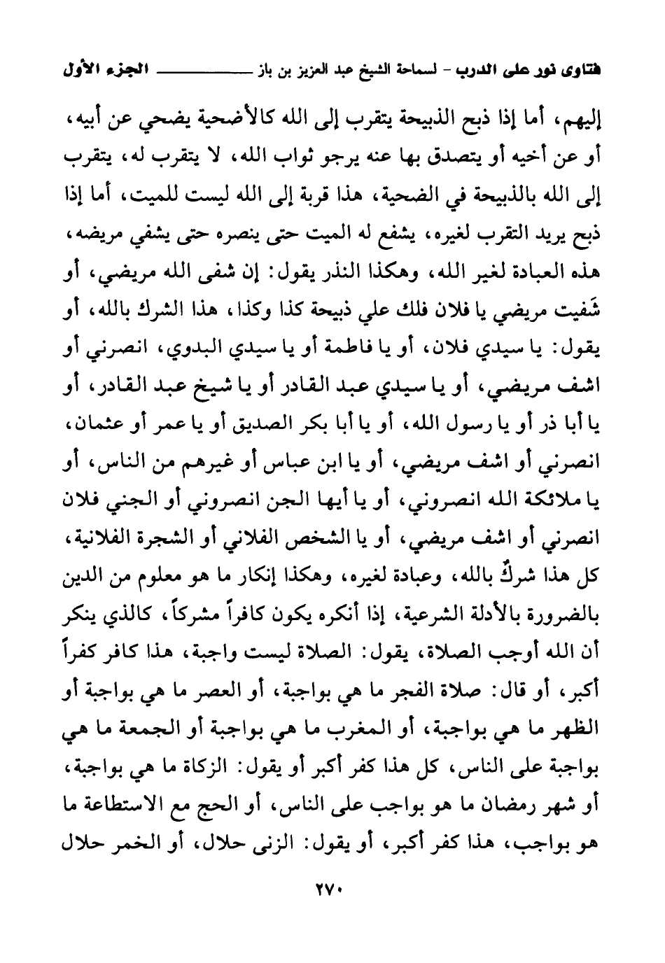 إليهم، أما إذا ذبح الذبيحة يتقرب إلى الله كالأضحية يضحي عن أبيه، أو عن أخيه أو يتصدق بها عنه يرجو ثواب الله، لا يتقرب له، يتقرب إلى الله بالذبيحة في الضحية، هذا قربة إلى الله ليست للميت، أما إذا ذبح يريد التقرب لغيره، يشفع له الميت حتى ينصره حتى يشفي مريضه، هذه العبادة لغير الله، وهكذا النذر يقول: إن شفى الله مريضي، أو شفيت مريضي يا فلان فلك علي ذبيحة كذا وكذا، هذا الشرك بالله، أو يقول: يا سيدي فلان، أو يا فاطمة أو يا سيدي البدوي، انصرني أو اشف مريضي، أو يا سيدي عبد القادر أو يا شيخ عبد القادر، أو يا أبا ذر أو يا رسول الله، أو يا أبا بكر الصديق أو يا عمر أو عثمان، انصرني أو اشف مريضي، أو يا ابن عباس أو غيرهم من الناس، أو يا ملائكة الله انصروني، أو يا أيها الجن انصروني أو الجني فلان انصرني أو اشف مريضي، أو يا الشخص الفلاني أو الشجرة الفلانية، كل هذا شرك بالله، وعبادة لغيره، وهكذا إنكار ما هو معلوم من الدين بالضرورة بالأدلة الشرعية، إذا أنكره يكون كافرا مشركا، كالذي ينكر أن الله أوجب الصلاة، يقول: الصلاة ليست واجبة، هذا كافر كفرا أكبر، أو قال: صلاة الفجر ما هي بواجبة، أو العصر ما هي بواجبة أو الظهر ما هي بواجبة، أو المغرب ما هي بواجبة أو الجمعة ما هي بواجبة على الناس، كل هذا كفر أكبر أو يقول: الزكاة ما هي بواجبة، أو شهر رمضان ما هو بواجب على الناس، أو الحج مع الاستطاعة ما هو بواجب، هذا كفر أكبر، أو يقول: الزنى حلال، أو الخمر حلال