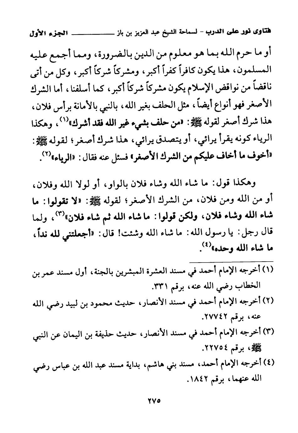 وهكذا قول: ما شاء الله وشاء فلان بالواو، أو لولا الله وفلان، أو من الله ومن فلان، من الشرك الأصغر؛ لقوله صلى الله عليه وسلم: «لا تقولوا: ما شاء الله وشاء فلان، ولكن قولوا: ما شاء الله ثم شاء فلان (¬3)»، ولما قال رجل: يا رسول الله: ما شاء الله وشئت! قال: «أجعلتني لله ندا، ما شاء الله وحده (¬4)».