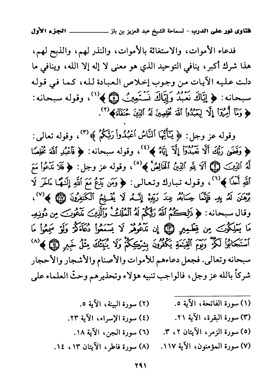 وقوله عز وجل: {يَا أَيُّهَا النَّاسُ اعْبُدُوا رَبَّكُمُ} (¬3). وقوله تعالى: {وَقَضَى رَبُّكَ أَلَّا تَعْبُدُوا إِلَّا إِيَّاهُ} (¬4) وقوله سبحانه: {فَاعْبُدِ اللَّهَ مُخْلِصًا لَهُ الدِّينَ} (¬5) {أَلَا لِلَّهِ الدِّينُ الْخَالِصُ} (¬6) وقوله عز وجل: {فَلَا تَدْعُوا مَعَ اللَّهِ أَحَدًا} (¬7) وقوله تبارك وتعالى: {وَمَنْ يَدْعُ مَعَ اللَّهِ إِلَهًا آخَرَ لَا بُرْهَانَ لَهُ بِهِ فَإِنَّمَا حِسَابُهُ عِنْدَ رَبِّهِ إِنَّهُ لَا يُفْلِحُ الْكَافِرُونَ} (¬8) وقال سبحانه: {ذَلِكُمُ اللَّهُ رَبُّكُمْ لَهُ الْمُلْكُ وَالَّذِينَ تَدْعُونَ مِنْ دُونِهِ مَا يَمْلِكُونَ مِنْ قِطْمِيرٍ} (¬9) {إِنْ تَدْعُوهُمْ لَا يَسْمَعُوا دُعَاءَكُمْ وَلَوْ سَمِعُوا مَا اسْتَجَابُوا لَكُمْ وَيَوْمَ الْقِيَامَةِ يَكْفُرُونَ بِشِرْكِكُمْ وَلَا يُنَبِّئُكَ مِثْلُ خَبِيرٍ} (¬10) سبحانه وتعالى. فجعل دعاءهم للأموات والأصنام والأشجار والأحجار شركا بالله عز وجل، فالواجب تنبيه هؤلاء وتحذيرهم وحث العلماء على