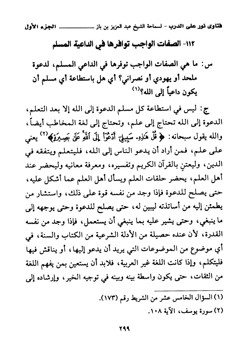 ج: ليس في استطاعة كل مسلم الدعوة إلى الله إلا بعد التعلم، الدعوة إلى الله تحتاج إلى علم، وتحتاج إلى لغة المخاطب أيضا، والله يقول سبحانه: {قُلْ هَذِهِ سَبِيلِي أَدْعُو إِلَى اللَّهِ عَلَى بَصِيرَةٍ} (¬2) يعني على علم، فمن أراد أن يدعو الناس إلى الله، فليتعلم ويتفقه في الدين، وليعتن بالقرآن الكريم وتفسيره، ومعرفة معانيه، وليحضر عند أهل العلم، يحضر حلقات العلم ويسأل أهل العلم عما أشكل عليه، حتى يصلح للدعوة، فإذا وجد من نفسه قوة على ذلك، واستشار من يطمئن إليه من أساتذته ليبين له، حتى يصلح للدعوة وحتى يوجهه إلى ما ينبغي وحتى يشير عليه بما ينبغي أن يستعمل، فإذا وجد من نفسه القدرة، لأن عنده حصيلة من الأدلة الشرعية من الكتاب والسنة، في أي موضوع من الموضوعات التي يريد أن يدعو إليها، أو يناقش فيها فليتكلم، وإذا كانت اللغة غير العربية، فلا بد أن يستعين بمن يفهم اللغة من الثقات، حتى يكون واسطة بينه وبينه في توجيه الخير، وإرشاده إلى