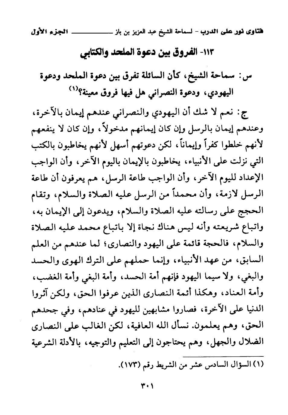 س: سماحة الشيخ، كأن السائلة تفرق بين دعوة الملحد ودعوة اليهودي، ودعوة النصراني، هل فيها فروق معينة؟ (¬1)