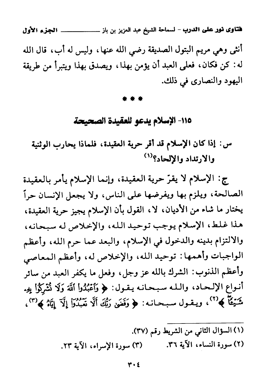ج: الإسلام لا يقر حرية العقيدة، وإنما الإسلام يأمر بالعقيدة الصالحة، ويلزم بها ويفرضها على الناس، ولا يجعل الإنسان حرا يختار ما شاء من الأديان، لا، القول بأن الإسلام يجيز حرية العقيدة، هذا غلط، الإسلام يوجب توحيد الله، والإخلاص له سبحانه، والالتزام بدينه والدخول في الإسلام، والبعد عما حرم الله، وأعظم الواجبات وأهمها: توحيد الله، والإخلاص له، وأعظم المعاصي وأعظم الذنوب: الشرك بالله عز وجل، وفعل ما يكفر العبد من سائر أنواع الإلحاد، والله سبحانه يقول: {وَاعْبُدُوا اللَّهَ وَلَا تُشْرِكُوا بِهِ شَيْئًا} (¬2)، ويقول سبحانه: {وَقَضَى رَبُّكَ أَلَّا تَعْبُدُوا إِلَّا إِيَّاهُ} (¬3)