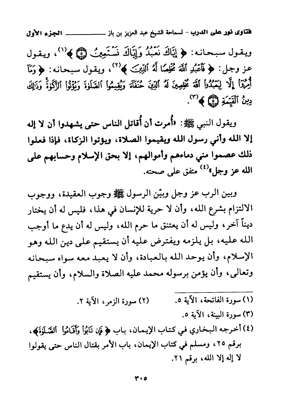 ويقول سبحانه {إِيَّاكَ نَعْبُدُ وَإِيَّاكَ نَسْتَعِينُ} (¬1) ويقول عز وجل: {فَاعْبُدِ اللَّهَ مُخْلِصًا لَهُ الدِّينَ} (¬2) ويقول سبحانه {وَمَا أُمِرُوا إِلَّا لِيَعْبُدُوا اللَّهَ مُخْلِصِينَ لَهُ الدِّينَ حُنَفَاءَ وَيُقِيمُوا الصَّلَاةَ وَيُؤْتُوا الزَّكَاةَ وَذَلِكَ دِينُ الْقَيِّمَةِ} (¬3).
