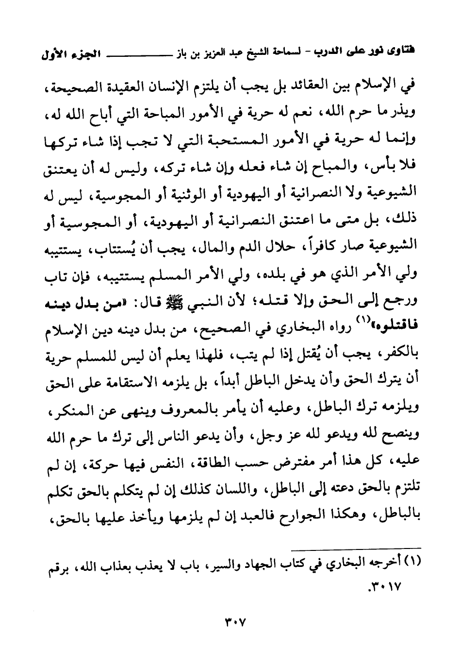 في الإسلام بين العقائد، بل يجب أن يلتزم الإنسان العقيدة الصحيحة، ويذر ما حرم الله، نعم له حرية في الأمور المباحة التي أباح الله له، وإنما له حرية في الأمور المستحبة التي لا تجب إذا شاء تركها فلا بأس، والمباح إن شاء فعله وإن شاء تركه، وليس له أن يعتنق الشيوعية ولا النصرانية أو اليهودية أو الوثنية أو المجوسية، ليس له ذلك، بل متى ما اعتنق النصرانية أو اليهودية، أو المجوسية أو الشيوعية صار كافرا، حلال الدم والمال، يجب أن يستتاب، يستتيبه ولي الأمر الذي هو في بلده، ولي الأمر المسلم يستتيبه، فإن تاب ورجع إلى الحق وإلا قتله؛ لأن النبي صلى الله عليه وسلم قال: «من بدل دينه فاقتلوه (¬1)» رواه البخاري في الصحيح، من بدل دينه دين الإسلام بالكفر، يجب أن يقتل إذا لم يتب، فلهذا يعلم أن ليس للمسلم حرية أن يترك الحق وأن يدخل الباطل أبدا، بل يلزمه الاستقامة على الحق، ويلزمه ترك الباطل، وعليه أن يأمر بالمعروف وينهى عن المنكر، وينصح لله ويدعو لله عز وجل، وأن يدعو الناس إلى ترك ما حرم الله عليه، كل هذا أمر مفترض حسب الطاقة، النفس فيها حركة، إن لم تلتزم بالحق دعته إلى الباطل، واللسان كذلك إن لم يتكلم بالحق تكلم بالباطل، وهكذا الجوارح فالعبد إن لم يلزمها ويأخذ عليها بالحق،