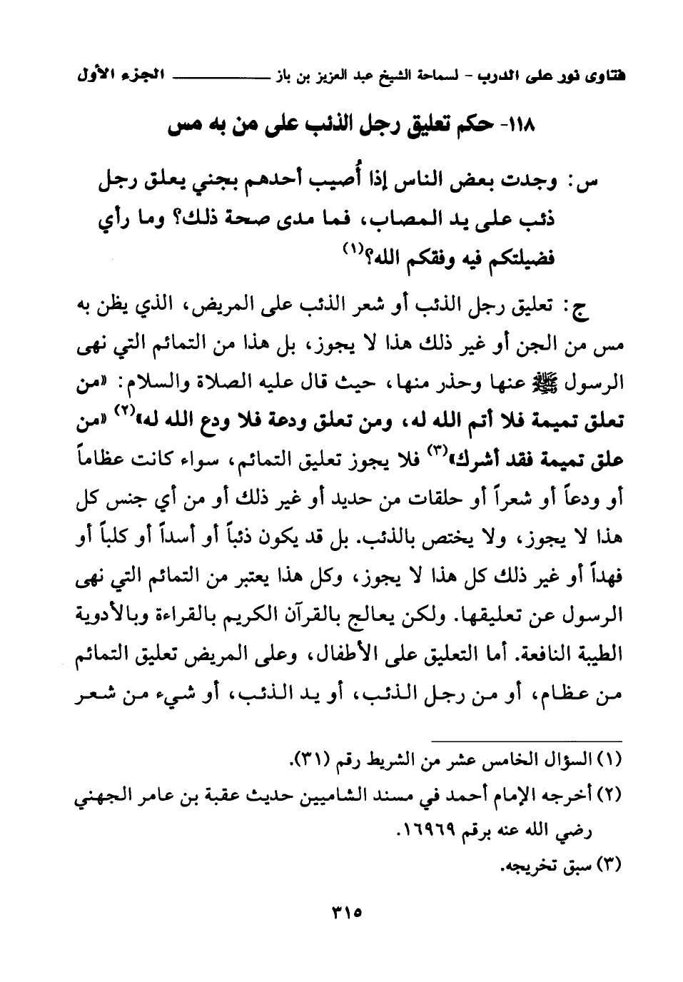 ج: تعليق رجل الذئب أو شعر الذئب على المريض، الذي يظن به مس من الجن أو غير ذلك هذا لا يجوز، بل هذا من التمائم التي نهى الرسول صلى الله عليه وسلم عنها وحذر منها، حيث قال عليه الصلاة والسلام: «من تعلق تميمة فلا أتم الله له، ومن تعلق ودعة فلا ودع الله له (¬2)»، «من علق تميمة فقد أشرك (¬3)» فلا يجوز تعليق التمائم، سواء كانت عظاما أو ودعا أو شعرا أو حلقات من حديد أو غير ذلك أو من أي جنس، كل هذا لا يجوز، ولا يختص بالذئب. بل قد يكون ذئبا أو أسدا أو كلبا أو فهدا أو غير ذلك كل هذا لا يجوز، وكل هذا يعتبر من التمائم التي نهى الرسول عن تعليقها. ولكن يعالج بالقرآن الكريم بالقراءة وبالأدوية الطيبة النافعة. أما التعليق على الأطفال، وعلى المريض، تعليق التمائم من عظام، أو من رجل الذئب، أو يد الذئب، أو شيء من شعر