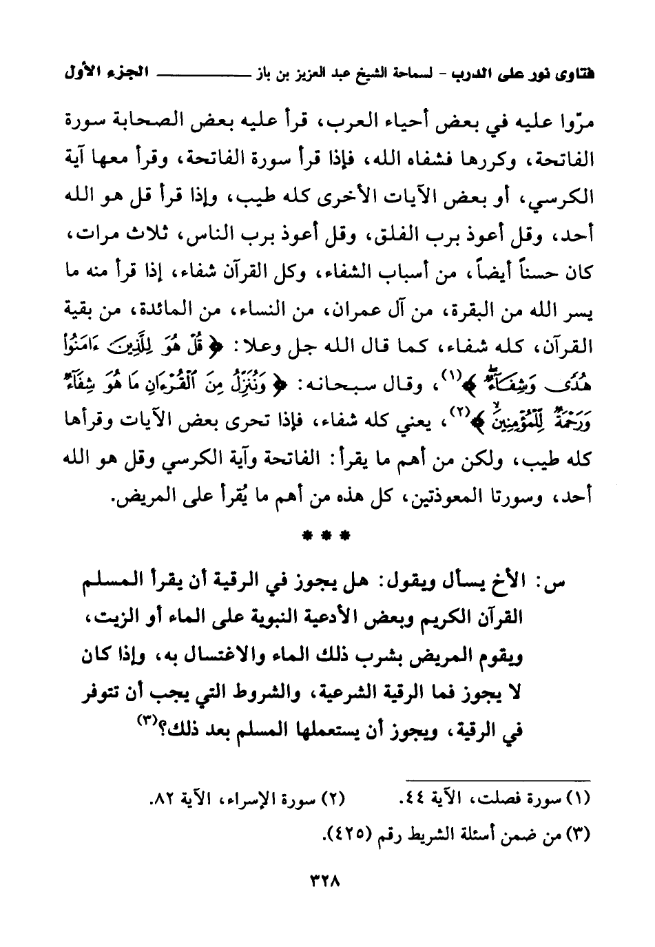 مروا عليه في بعض أحياء العرب قرأ عليه بعض الصحابة سورة الفاتحة، وكررها فشفاه الله، فإذا قرأ سورة الفاتحة، وقرأ معها آية الكرسي، أو بعض الآيات الأخرى كله طيب، وإذا قرأ قل هو الله أحد وقل أعوذ برب الفلق، وقل أعوذ برب الناس، ثلاث مرات، كان حسنا أيضا من أسباب الشفاء، وكل القرآن شفاء، إذا قرأ منه ما يسر الله من البقرة، من آل عمران، من النساء من المائدة، من بقية القرآن، كله شفاء كما قال الله جل وعلا: {قُلْ هُوَ لِلَّذِينَ آمَنُوا هُدًى وَشِفَاءٌ} (¬1) وقال سبحانه: {وَنُنَزِّلُ مِنَ الْقُرْآنِ مَا هُوَ شِفَاءٌ وَرَحْمَةٌ لِلْمُؤْمِنِينَ} (¬2) يعني كله شفاء، فإذا تحرى بعض الآيات وقرأها كله طيب، ولكن من أهم ما يقرأ: الفاتحة وآية الكرسي وقل هو الله أحد، وسورتا المعوذتين، كل هذه من أهم ما يقرأ على المريض.