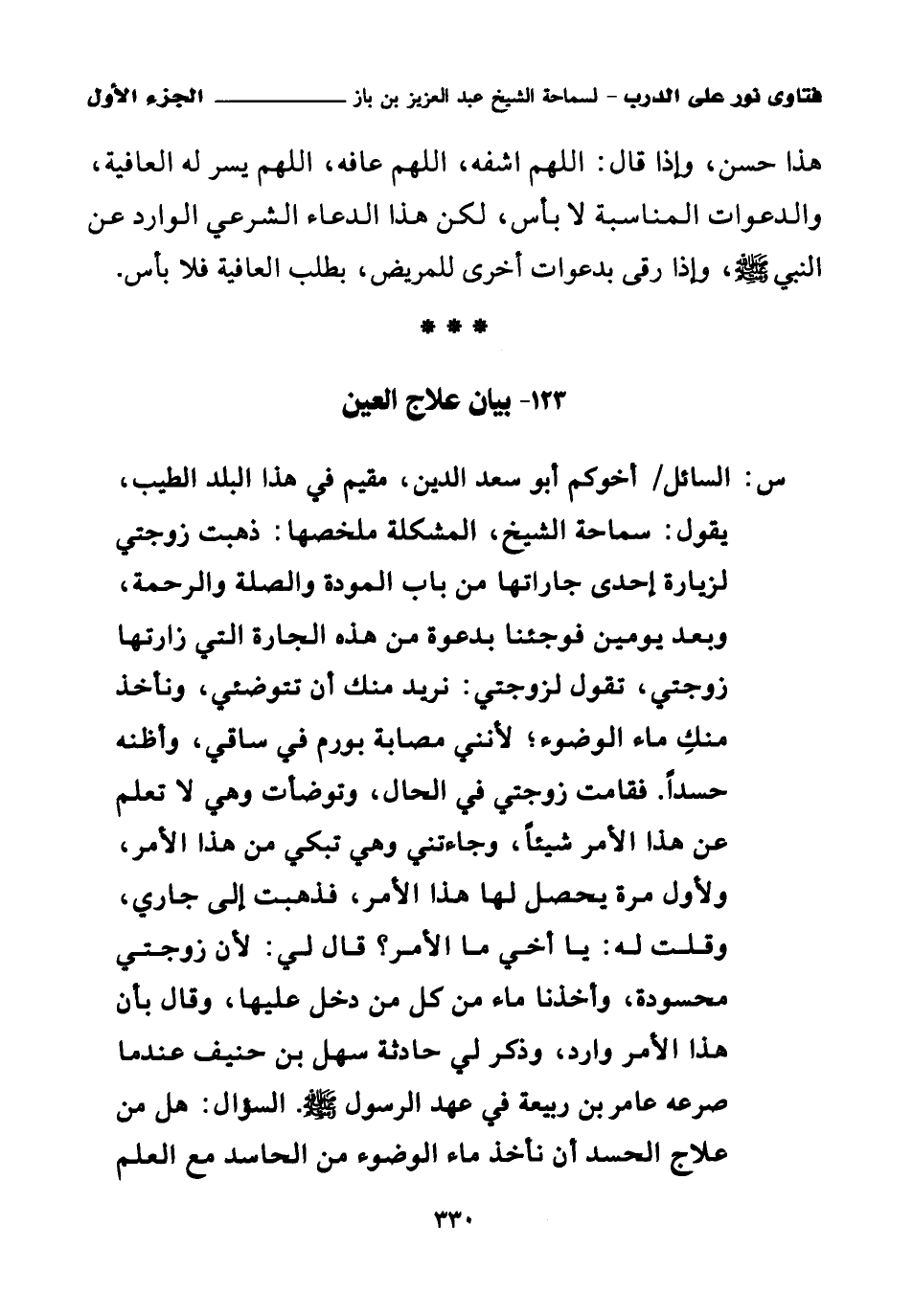 س: السائل أخوكم أبو سعد الدين، مقيم في هذا البلد الطيب، يقول: سماحة الشيخ، المشكلة ملخصها: ذهبت زوجتي لزيارة إحدى جاراتها من باب المودة والصلة والرحمة، وبعد يومين فوجئنا بدعوة من هذه الجارة التي زارتها زوجتي تقول لزوجتي: نريد منك أن تتوضئي، ونأخذ منك ماء الوضوء؛ لأنني مصابة بورم في ساقي، وأظنه حسدا، فقامت زوجتي في الحال، وتوضأت وهي لا تعلم عن هذا الأمر شيئا، وجاءتني وهي تبكي من هذا الأمر، ولأول مرة يحصل لها هذا الأمر، فذهبت إلى جاري وقلت له: يا أخي ما الأمر؟ قال لي: لأن زوجتي محسودة، وأخذنا ماء من كل من دخل عليها، وقال بأن هذا الأمر وارد، وذكر لي حادثة سهل بن حنيف عندما صرعه عامر بن ربيعة في عهد الرسول صلى الله عليه وسلم. السؤال: هل من علاج الحسد أن نأخذ ماء الوضوء من الحاسد؟ مع العلم