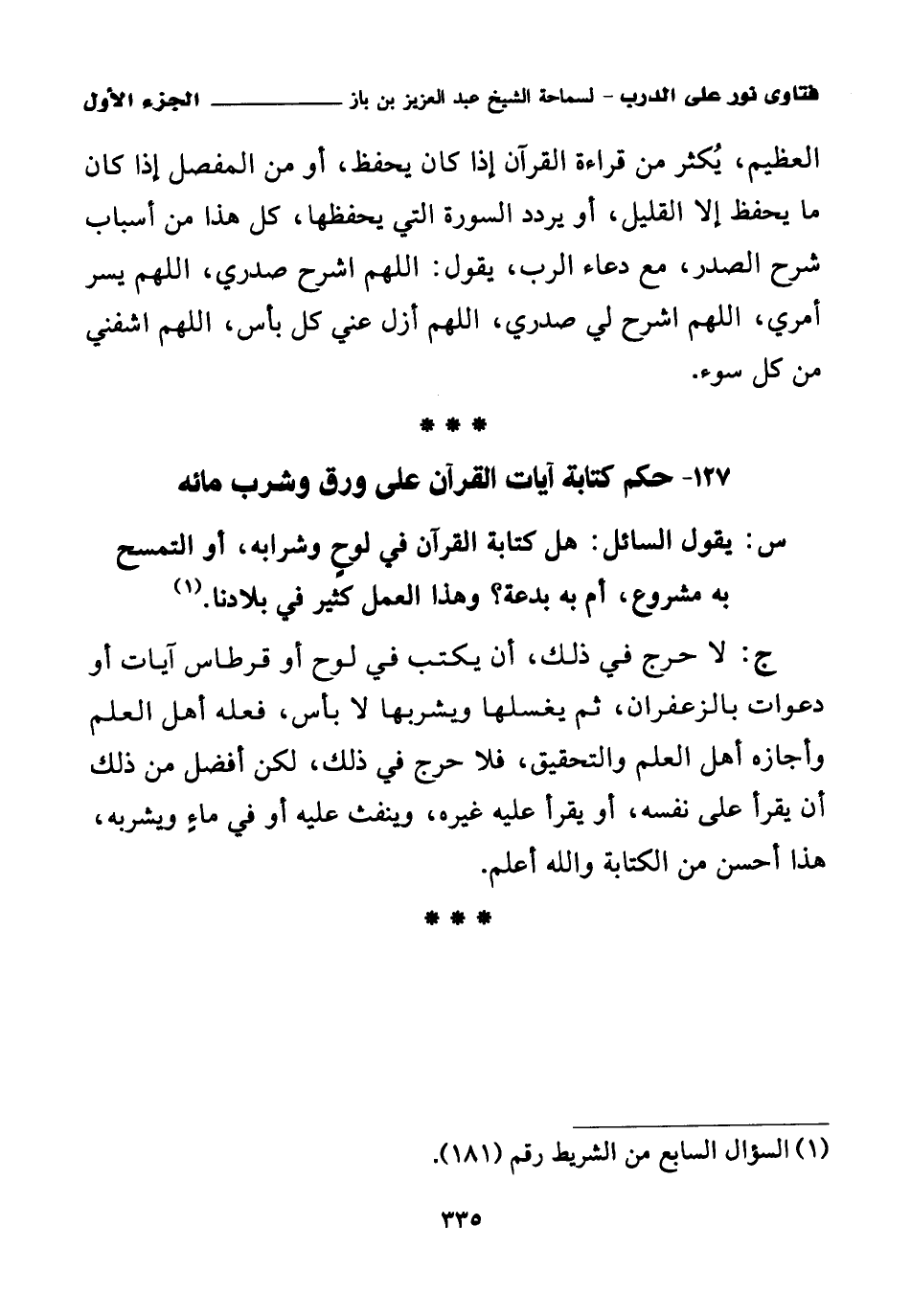 127 - حكم كتابة آيات القرآن على ورق وشرب مائه
