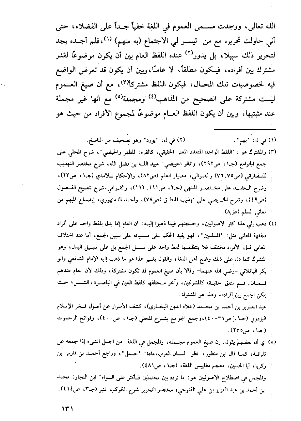 الله تعالى, ووجدت مسمى العموم في اللغة خفياً جداً على الفضلاء, حتى أني حاولت تحريره مع من تيسر لي الاجتماع به منهم, فلم أجده يجد لتحرير ذلك سبيلا, بل يدور عنده اللفظ العام بين أن يكون موضوعاً لقدر مشترك بين أفراده, فيكون مطلقاً, لا عاماً, وبين أن يكون قد تعرض الواضع فيه لخصوصيات تلك المحال, فيكون اللفظ مشتركاً, مع أن صيغ العموم ليست مشتركة على الصحيح من المذاهب ومجملة مع أنها غير مجملة عند مثبتيها, وبين أن يكون اللفظ العام موضوعاً لمجموع الأفراد من حيث هو