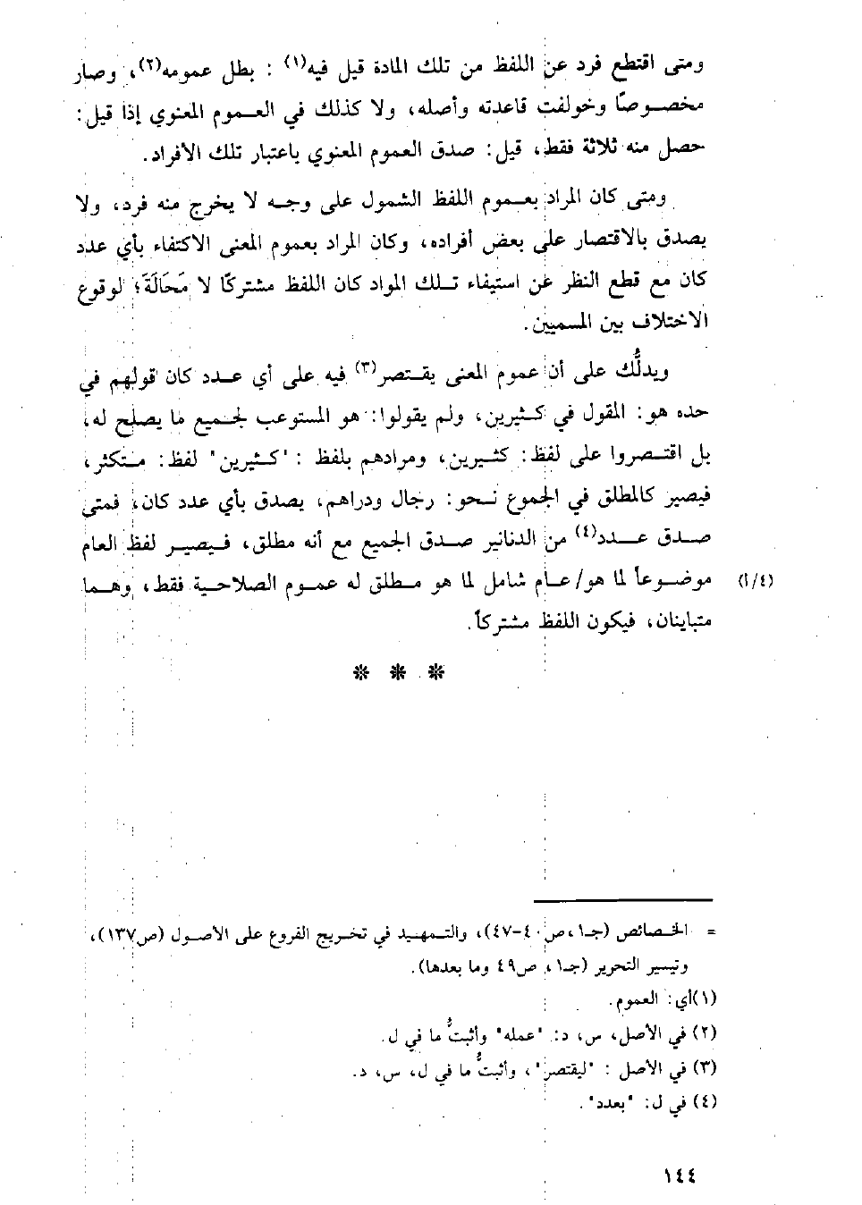 ومتى كان المراد بعموم اللفظ الشمول على وجه لا يخرج منه فرد, ولايصدق بالاقتصار على بعض أفراده, وكان المراد بعموم المعنى الاكتفاء بأي عدد كان مع قطع النظر عن استيفاء تلك المواد كان اللفظ مشتركاً لا مَحَالَةَ, لوقوع الأختلاف بين المسميين.