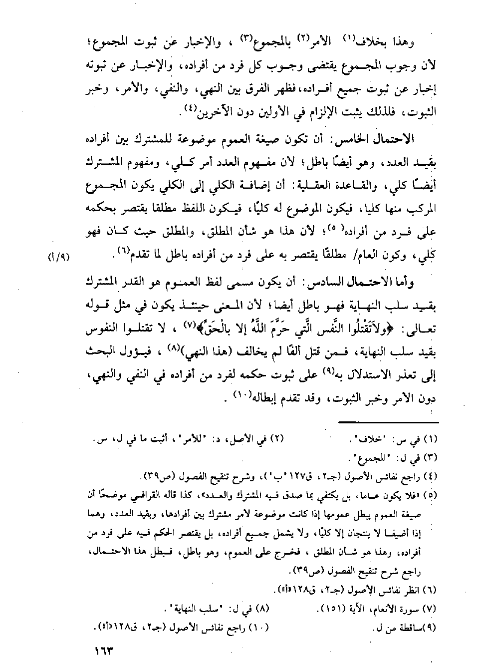 وأما الاحتمال السادس: أن يكون مسمى لفظ العموم هو القدر المشترك بقيد سلب النهاية فهو باطل أيضاً, لأن المعنى حينئذ يكون في مثل قوله تعالى: ((ولا تقتلوا النفس التي حرم الله إلا بالحق)) , لا تقتلوا النفوس بقيد سلب النهاية, فمن قتل ألفا لم يخالف ها النهي, فيؤول البحث إلى عدم الاستدلال به على ثبوت حكمه لفرد من أفراده في النفي والنهي, دون الأمر وخبر الثبوت, وقد تقدم إبطاله.