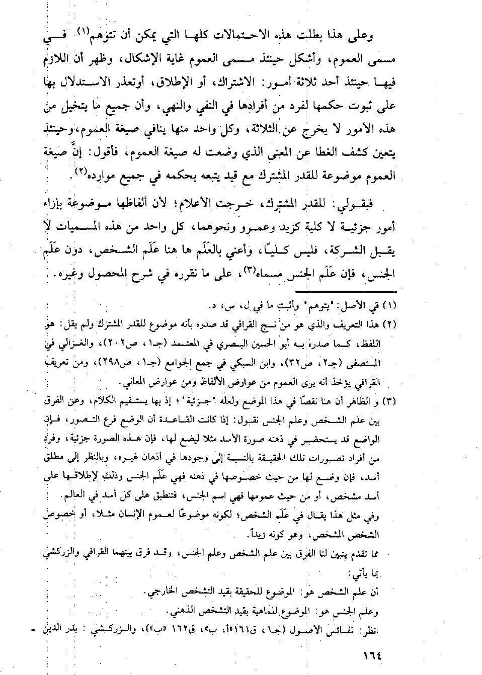 فبقولي: للقدر المشترك, خرجت الأعلام, لأن ألفاظها موضوعة بإزاء أمور جزئية لا كلية كزيد وعمرو ونحوهما, كل واحد من هذه المسميات لا يقبل الشركة, فليس كلياً, وأعني بالعلم هاهنا علم الشخص, دون علم الجنس, فإن علم الجنس مسماه, على ما نقرره في شرح المحصول وغيره
