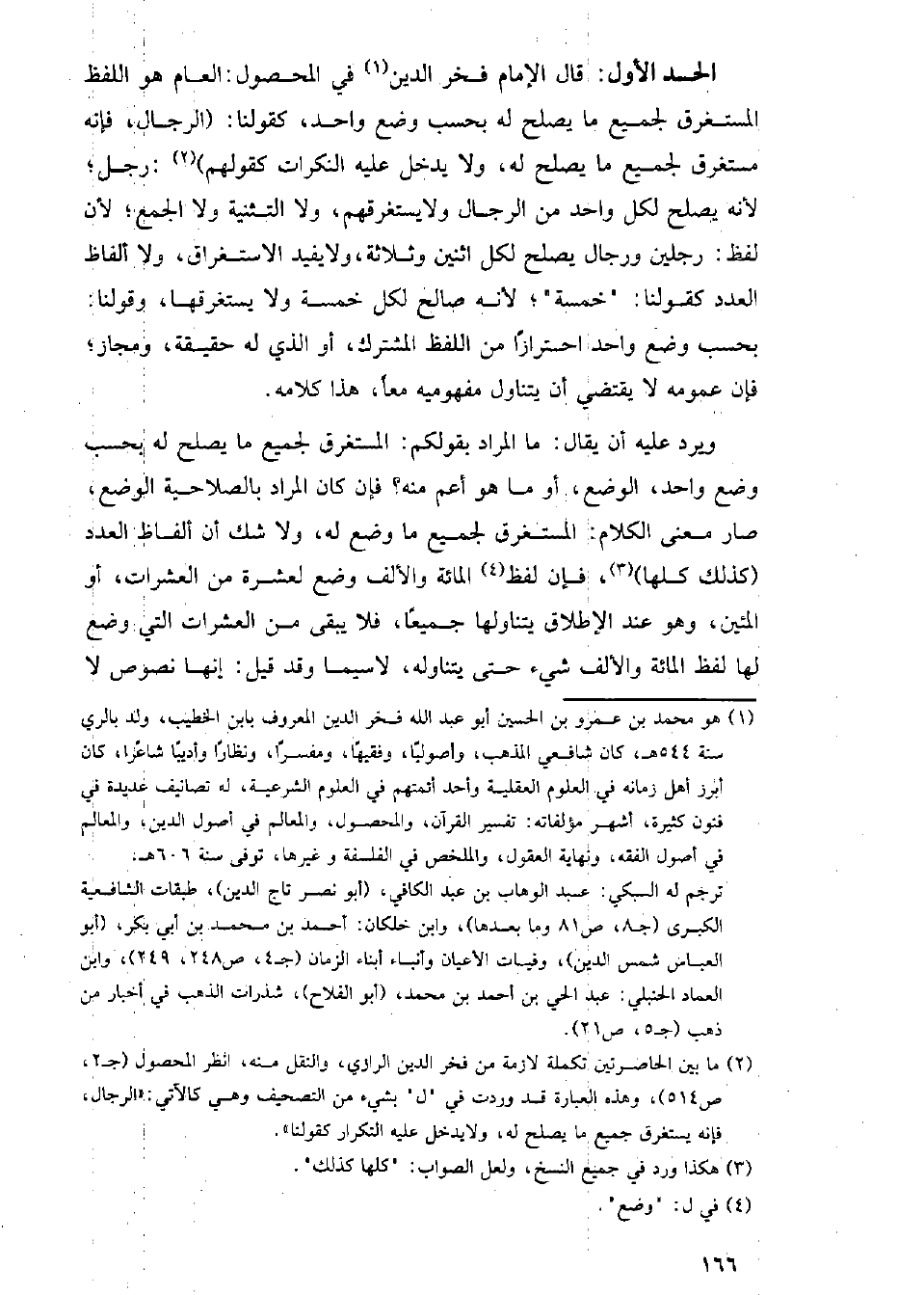 الحد الأول: قال الإمام فخر الدين في المحصول: العام هو اللفظ المستغرق لجميع ما يصلح له بحسب وضع واحد, كقولنا: الرجال, فإنه مستغرق لجميع ما يصلح له, ولا يدخل عليه النكرات كقولهم: رجل, لأنه يصلح لكل واحد من الرجال ولا يستغرقهم, ولا التثنية ولا الجمع, لأن لفظ: رجلين ورجال يصلح لكل اثنين وثلاثة, ولا يفيد الاستغراق, ولا ألفاظ العدد كقولنا: خمسة, لأنه صالح لكل خمسة ولا يستغرقها, وقولنا: بحسب وضع واحد احترازا من اللفظ المشترك, أو الذي له حقيقة, ومجاز, فإن عمومه لا يقتضي أن يتناول مفهوميه معاَ, هذا كلامه.