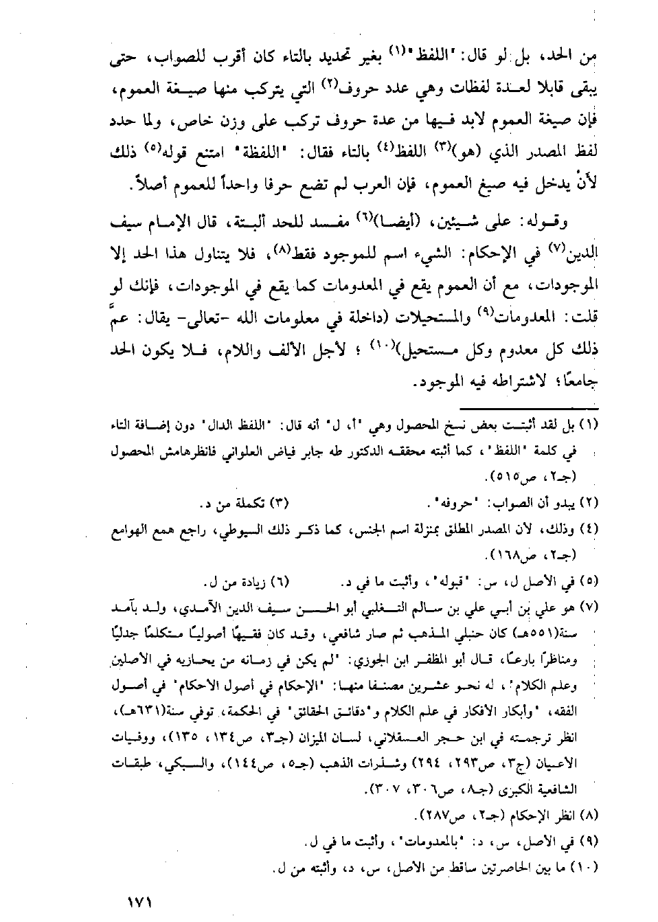 من الحد, بل لو قال: اللف بغير تحديد بالتاء كان أقرب للصواب, حتى يبقى قابلاً لعدة لفظات وهي عدد حروف التي يتركب منها صيغ العموم, فإن صيغة العموم لابد فيها من عدة حروف تركب على وزن خاص, ولما حدد لفظ المصدر الذي هو اللفظ بالتاء فقال: اللفظة امتنع قوله ذلك لأن يدخل فيه ضيغة العموم, فإن العرب لم تضع حرفا واحدًا للعموم.