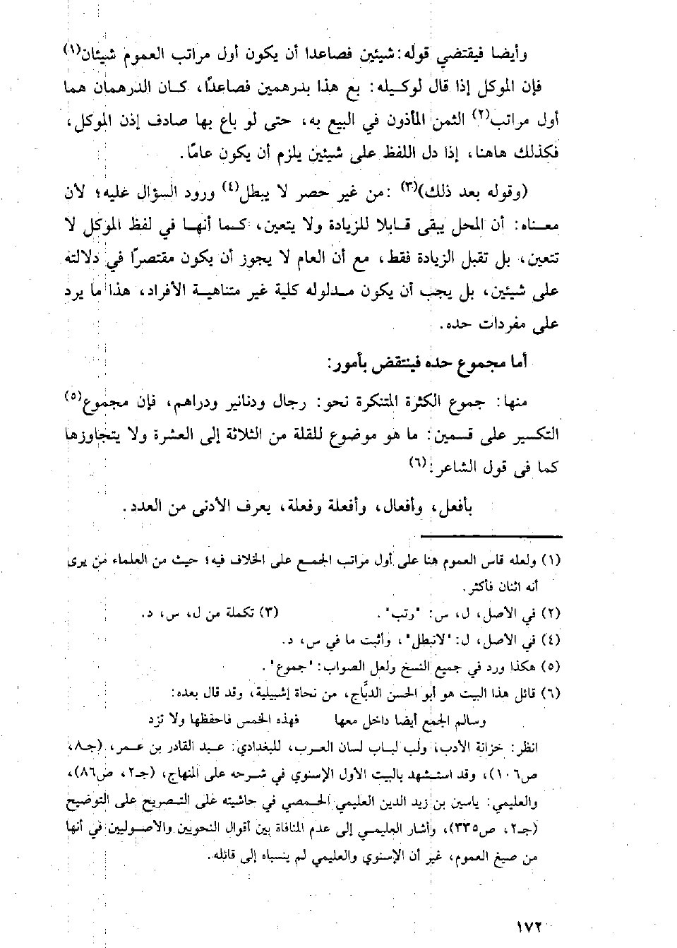 منها جموع الكثرة المتنكرة نحو رجال ودنانير ودراهم, فإن مجموع التكسير على قسمين: ما هو موضوع القلة من الثلاثة إلى العشرة ولا يتجاوزها كما في قول الشاعر: