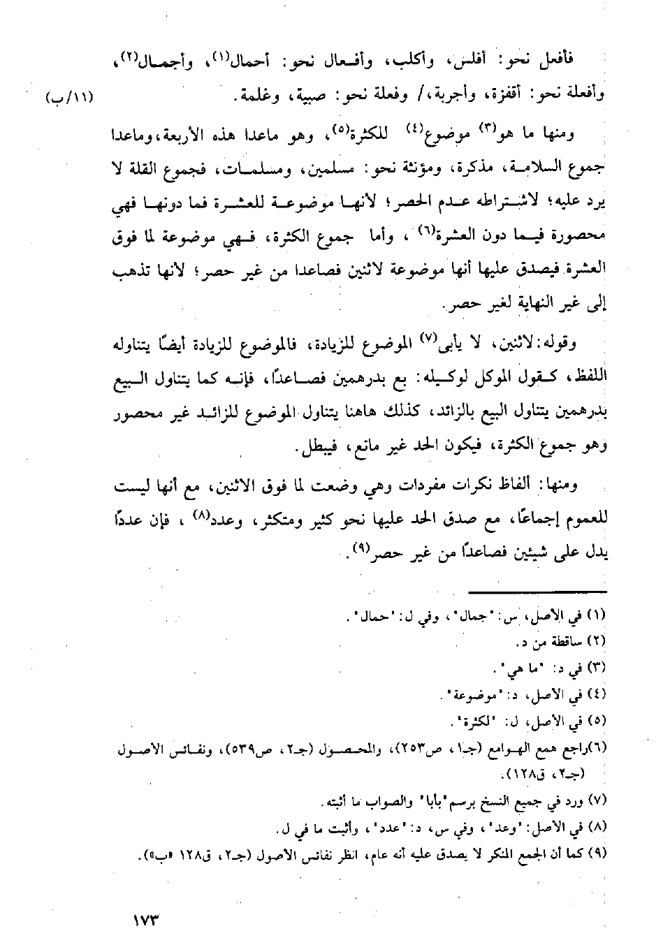 ومنها ما هو موضوع للكثرة, وهو ماعدا هذه الأربعة, وماعدا جموع السلامة, مذكرة, ومؤنثة نحو مسلمين, ومسلمات, لأنها موضوعة للعشرة فما دونها فهي موضوعة لما فوق العشرة فيصدق عليها أنها موضوعة لاثنين فصاعدا من غير حصر, لأنها تذهب لغير حصر.