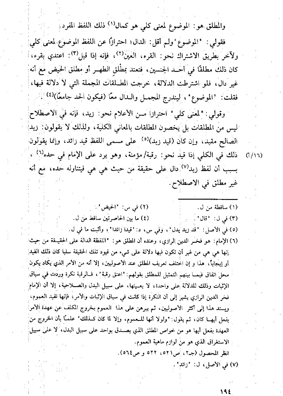 فقولي: (الموضوع) ولم أقل: الدال؛ احترازا عن اللفظ الموضوع لمعنى كلي ولآخر بطريق الاشتراك نحو: القرء، القين، فإنه إذا قيل: اعتدي بقرء، كان ذلك مطلقا في أحد الجنسين، فتعتد بمطلق الطهر أو مطلق الحيض مع أنه غير دال، فلو اشترطت الدلالة، خرجت المطلقات المجملة التي لا دلالة فيها، فقلت: (الموضوع)، ليندرج المجمل والدال معا (فيكون الحد جامعا).