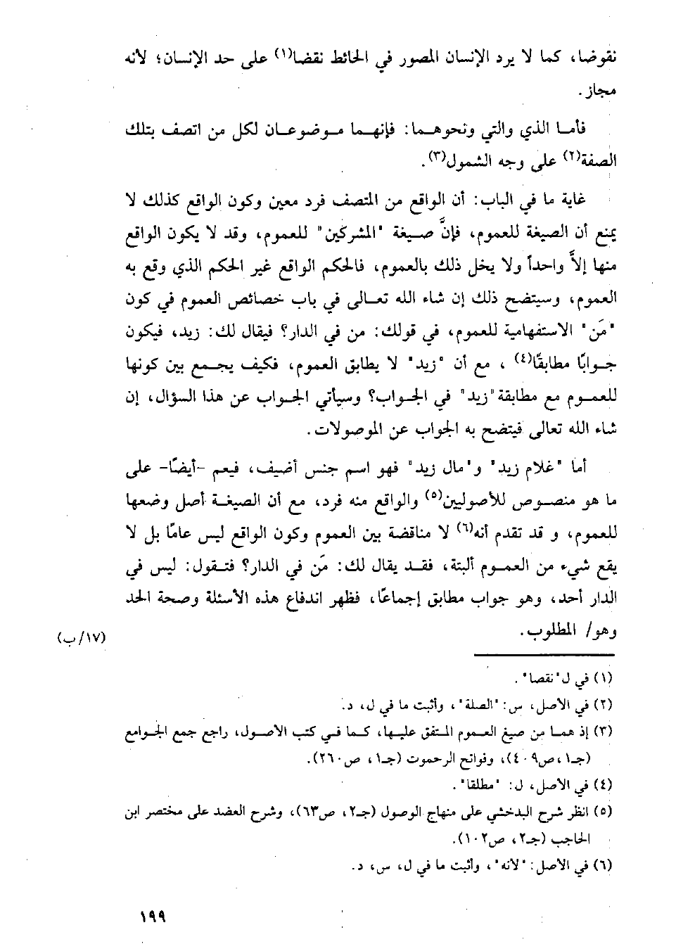 أما (غلام زيد) و (مال زيد) فهو اسم جنس أضيف، فيعم - أيضا- على ما هو منصوص للأصوليين والواقع منه فرد، مع أن الصيغة أصل وضعها للعموم، وقد تقدم أنه لا مناقضة بين العموم وكون الواقع ليس عاما بل لا يقع شيء من العموم ألبتة، فقد يقال لك، من في الدار؟ فتقول: ليس في الدار أحد، وهو جواب مطابق إجماعا، فظهر اندفاع هذه الأسئلة وصحة الحد وهو/ المطلوب.
