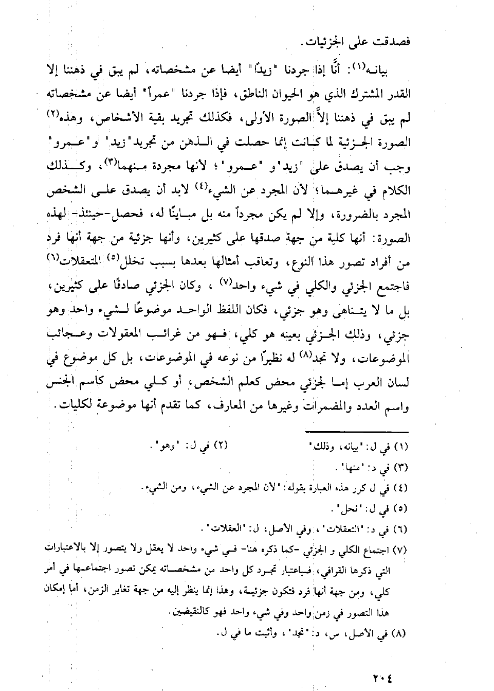 بيانه: أنا إذا جردنا (زيدا) أيضا عن مشخصاته، لم يبق في ذهننا إلا القدر المشترك الذي هو الحيوان الناطق، فإذا جردنا (عمرا) أيضا عن مشخصاته لم يبق في ذهننا إلا الصورة الأولى، فكذلك تجريد بقية الأشخاص، وهذه الصورة الجزئية لما كانت إنما حصلت في الذهن من تجريد (زيد) و) عمرو) وجب أن يصدق على (زيد) و) عمرو)؛ لأنها مجردة منهما، وكذلك الكلام في غيرهما؛ لأن المجرد عن الشيء لا بد أن يصدق على الشخص المجرد بالضرورة، وإلا لما يكن مجرد منه بل مباينا له، فحصل - حينئذ- لهذه الصورة: أنها كلية من جهة صدقها على كثيرين، وأنها جزئية من جهة أنها فرد من أفراد تصور هذا النوع، وتعاقب أمثالها بعدها بسبب تخلل المتعقلات فاجتمع الجزئي والكلي في شيء واحد، وكان الجزئي صادقا على كثيرين، بل ما لا يتناهى وهو جزئي، فكان اللفظ الواحد موضوعا لشيء واحد وهو جزئي، وذلك الجزئي بعينه هو كلي، فهو من غرائب المعقولات وعجائب الموضوعات، ولا تجد له نظيرا من نوعه في الموضوعات، بل كل موضوع في لسان العرب إما لجزئي محض كعلم الشخص، أو كلي محض كاسم الجنس واسم العدد والمضمرات وغيرها من المعارف، كما تقدم أنها موضوعة لكليات.