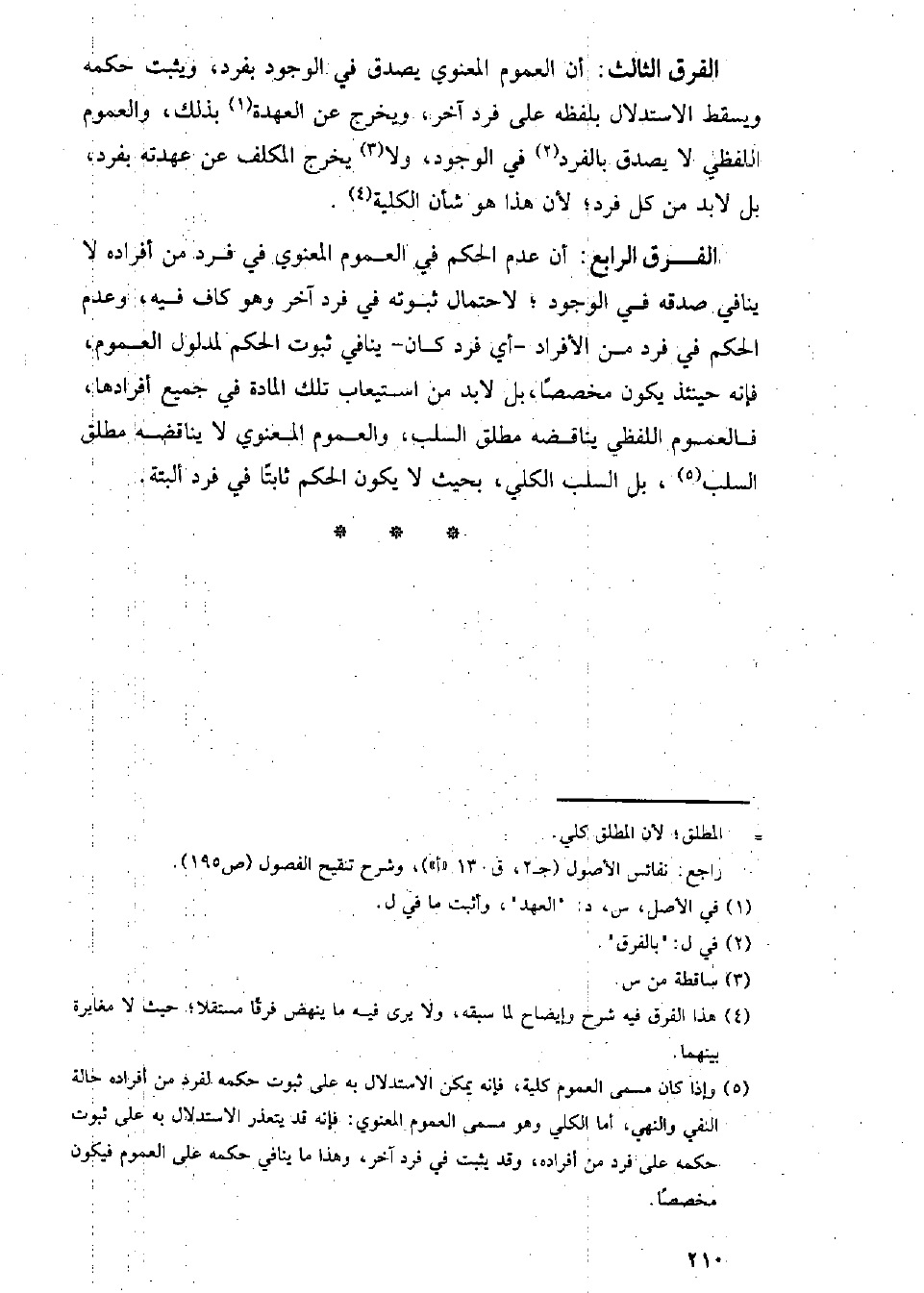 الفرق الرابع: أن عدم الحكم في العموم المعنوي في فرد من أفراده لا ينافي صدقه في الوجود؛ لاحتمال ثبوته في فرد آخر وهو كاف فيه، وعدم الحكم في فرد من الأفراد- أي فرد كان- ينافي ثبوت الحكم لمدلول العموم، فإنه حينئذ يكون مخصصا، بل لا بد من استيعاب تلك المادة في جميع أفرادها، في العموم اللفظي يناقضه مطلق السلب، بل السلب الكلي، بحيث لا يكون الحكم ثابتا في فرد ألبتة.