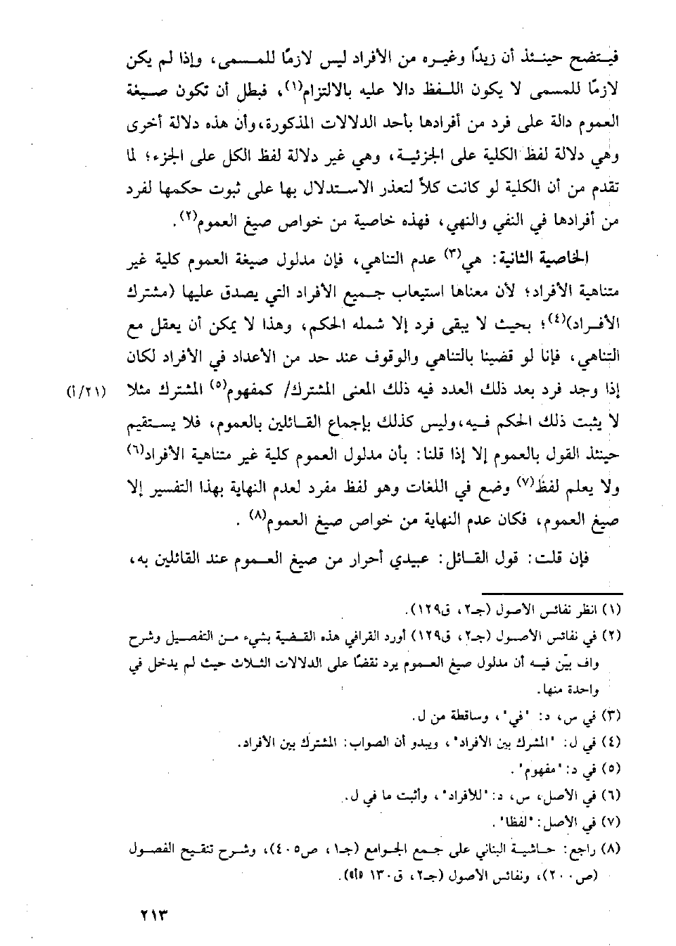 الخاصية الثانية: هي عدم التناهي، فإن مدلول صيغة العموم كلية غير متناهية الأفراد؛ لأن معناها استيعاب جميع الأفراد التي يصدق عليها (مشترك الأفراد)؛ بحيث لا يبقى فرد إلا شمله الحكم، وهذا لا يمكن أن يعقل مع التناهي، فإنا لو قضينا بالتناهي والوقوف عند حد من الأعداد في الأفراد لكان إذا وجد فرد بعد ذلك العدد فيه ذلك المعنى المشترك/ كمفهوم المشترك مثلا لا يثبت ذلك الحكم فيه، وليس كذلك بإجماع القائلين بالعموم، فلا يستقيم حينئذ القول بالعموم إلا إذا قلنا: بأن مدلول العموم كلية غير متناهية الأفراد ولا يعلم اللفظ وضع في اللغات وهو لفظ مفرد لعدم النهاية بهذا التفسير إلا صيغ العموم، فكان عدم النهاية من خواص صيغ العموم.