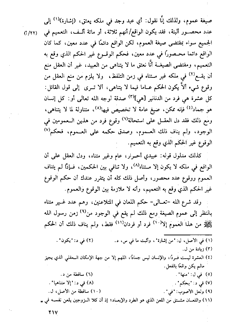 كذلك مدلول قوله: عبيدي أحرار، عام وغير متناه، ودل العقل على أن الواقع في ملكه لا يكون إلا متناه، ولا ينافي بين الحكمين، فإذا لم يتناف العموم ووقوع عدد محصور، وأصل ذلك كله أن يتقرر عندك أن حكم الوقوع غير الحكم الذي وقع به التعميم، وأنه لا ملازمة بين الوقوع والعموم.