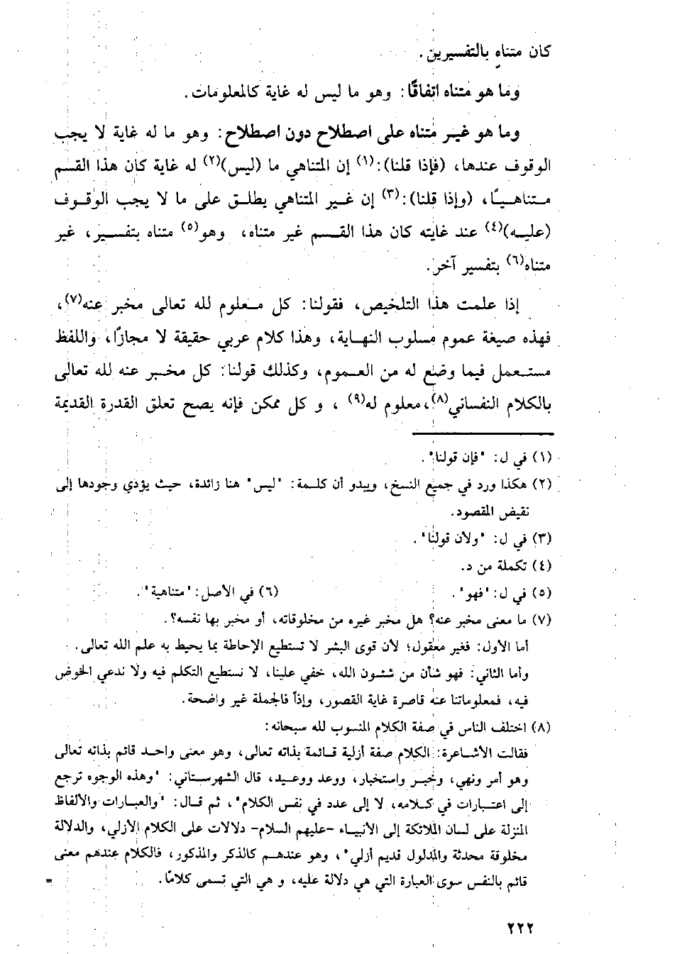 إذا علمت هذا التلخيص، فقولنا: كل معلوم لله تعالى مخبر عنه، فهذه صيغة عموم مسلوب النهاية، وهذا كلام عربي حقيقة لا مجازا، واللفظ مستعمل فيما وضع له من العموم، وكذلك قولنا: كل مخبر عنه لله تعالى بالكلام النفساني، معلوم له، وكل ممكن فإنه يصح تعلق القدرة القديمة