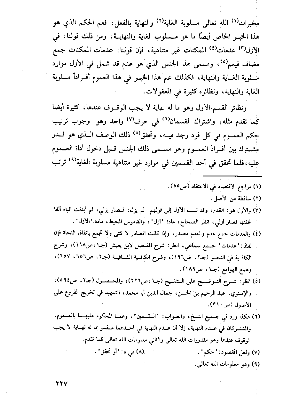مخبرات الله تعالى مسلوبة الغاية والنهاية بالفعل، فعم الحكم الذي هو هذا الخبر الخاص أيضا ما هو مسلوب الغاية والنهاية، ومن ذلك قولنا: في الأزل عدمات الممكنات غير متناهية، فإن قولنا: عدمات الممكنات جمع مضاف فيعم، ومسمى هذا الجنس الذي هو عدم قد شمل في الأزل موارد مسلوبة الغاية والنهاية، فكذلك عم هذا الخبر في هذا العموم أفرادا مسلوبة الغاية والنهاية، ونظائره كثيرة في المعقولات.
