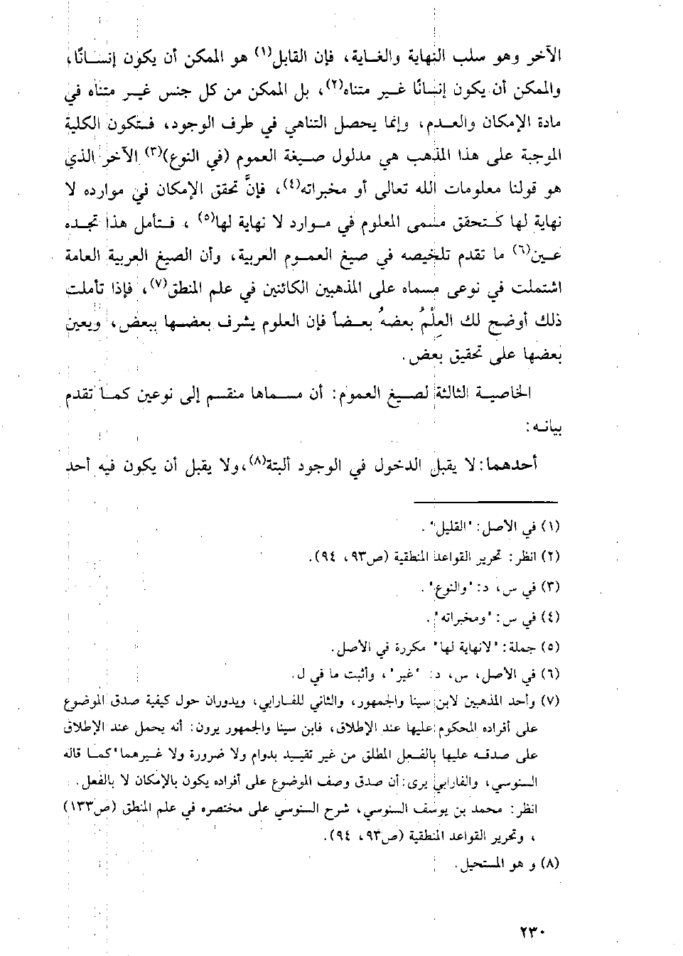 الآخر وهو سلب النهاية والغاية، فإن القابل هو الممكن أن يكون إنسانا، والممكن أن يكون إنسانا غير متناه، بل الممكن من كل جنس غير متناه في مادة الإمكان والعدم، وإنما يحصل التناهي في طرف الوجود، فتكون الكلية الموجبة على هذا المذهب هي مدلول صيغة العموم (في النوع) الآخر الذي هو قولنا معلومات الله تعالى أو مخبراته، فإن تحقق الإمكان في موارده لا نهاية لها كتحقق مسمى المعلوم في موارد لانهاية لها، فتأمل هذا تجده عين ما تقدم تلخيصه في صيغ العموم العربية، وأن الصيغ العربية العامة اشتملت في نوعي مسماه في المذهبين الكائنين في علم المنطق، فإذا تأملت ذلك أوضح لك العلم بعضه بعضا فإن العلوم يشرف بعضها ببعض، وبعين بعضها على تحقيق بعض.