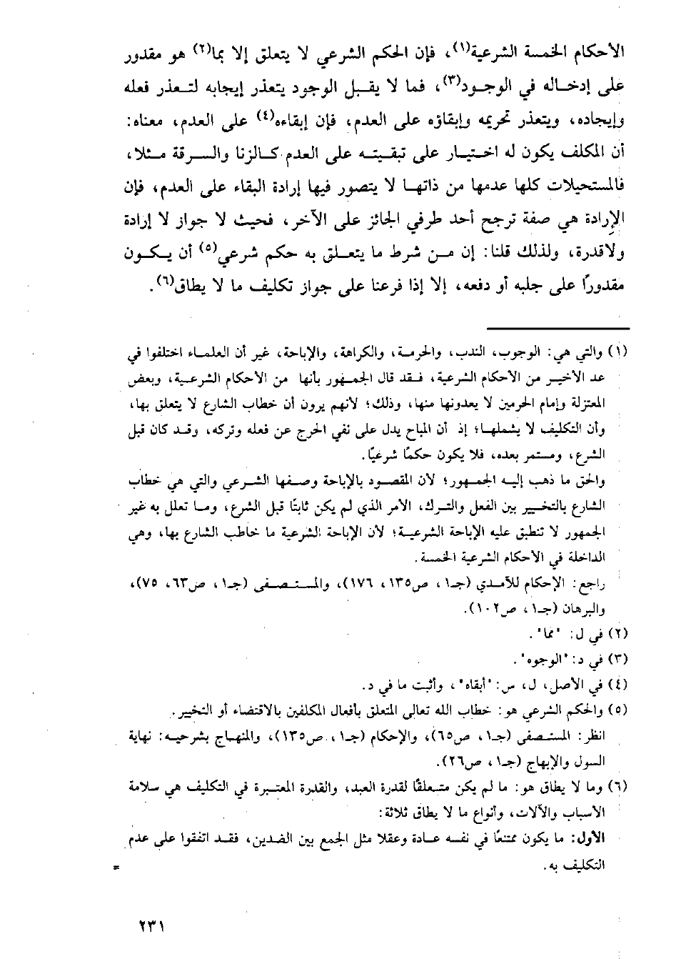 الأحكام الخمسة الشرعية، فإن الحكم الشرعي لا يتعلق إلا بما هو مقدور على إدخاله في الوجود، فما لا يقبل الوجود يتعذر إيجابه لتعذر فعله وإيجاده، ويتعذر تحريمه وإبقاؤه على العدم، فإن إبقاءه على العدم، معناه: أن المكلف يكون له اختيار على تبقيته على العدم كالزنا والسرقة مثلا، فالمستحيلات كلها عدمها من ذاتها لا يتصور فيها إرادة البقاء على العدم، فإن الإرادة هي صفة ترجح أحد طرفي الجائز على الآخر، فحيث لا جوز لا إرادة ولا قدرة، ولذلك قلنا: إن من شرط ما يتعلق به حكم شرعي أن يكون مقدورا على جلبه أو دفعه، إلا إذا فرعنا على جواز تكليف ما لا يطاق.