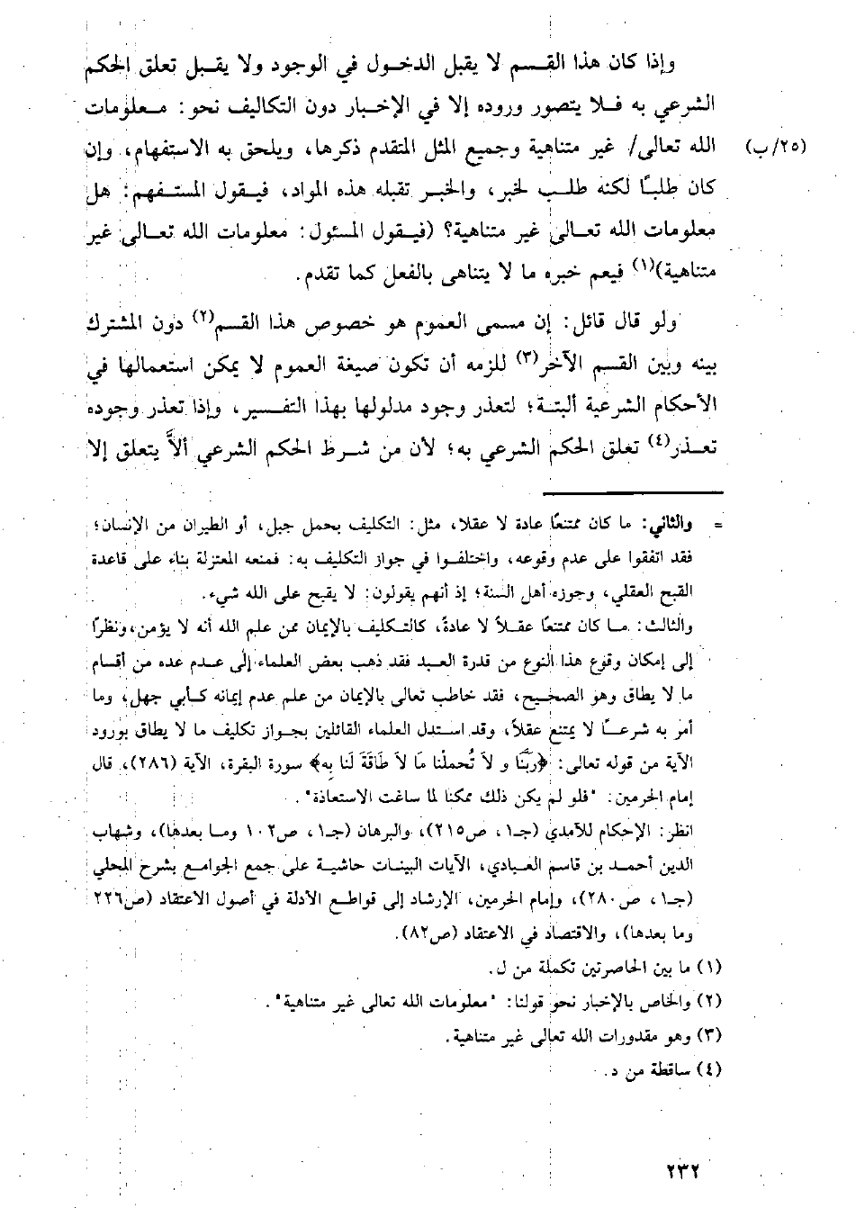 وإذا كان هذا القسم لا يقبل الدخول في الوجود ولا يقبل تعلق الحكم الشرعي به فلا يتصور وروده إلا في الإخبار دون التكاليف نحو: معلومات الله تعالى/ غير متناهية وجميع المثل المتقدم ذكرها، ويلحق به الاستفهام، وإن كان طلبا لكنه طلب لخبر، والخبر تقبله هذه الموارد، فيقول المستفهم: هل معلومات الله تعالى غير متناهية؟ (فيقول المسئول: معلومات الله تعالى غير متناهية) فيعم خبره ما لا يتناهى بالفعل كما تقدم.