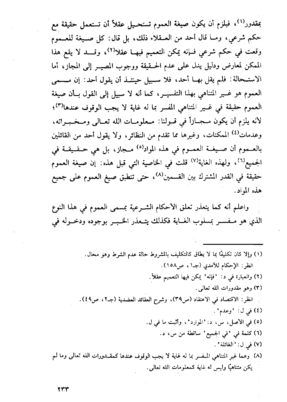 بمقدور، فيلزم أن يكون صيغة العموم تستحيل عقلا أن تستعمل حقيقة مع حكم شرعي، وما قال أحد من العقلاء ذلك، بل قال: كل صيغة للعموم وقعت في حكم شرعي فإنه يمكن التعميم فيها عقلا، وقد لا يقع هذا الممكن لمعارض ودليل يدل على عدم الحقيقة ووجوب المصير إلى المجاز، أما الاستحالة: فلم يقل بها أحد، فلا سبيل حينئذ أن يقول أحد: إن مسمى العموم هو غير المتناهي بهذا التفسير، كما أنه لا سبيل إلى القول بأن صيغة العموم حقيقة في غير المتناهي المفسر بما له غاية لا يجب الوقوف عندها؛ لأنه يلزم أ، يكون مجازا في قولنا: معلومات الله تعالى ومخبراته، وعدمات الممكنات، وغيرها مما تقدم من النظائر، ولا يقول أحد من القائلين بالعموم أن صيغة العموم في هذه المواد مجاز، بل هي حقيقة في الجميع، ولهذه الغاية قلت في الخاصية التي قبل هذه: إن صيغة العموم حقيقة في القدر المشترك بين القسمين، حتى تنطبق صيغ العموم على جميع هذه الموارد.