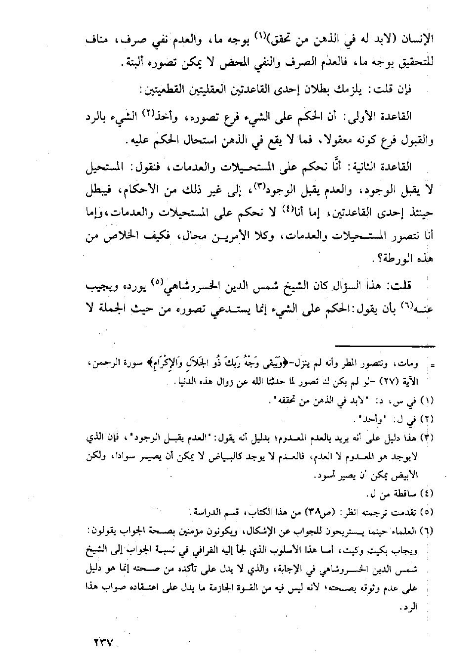 القاعدة الثانية: أنا نحكم على المستحيلات والعدمات، فنقول: المستحيل لا يقبل الوجود، والعدم يقبل الوجود، إلى غير ذلك من الأحكام، فيبطل حينئذ أحدى القاعدتين، إما أن لا نحكم على المستحيلات والعدمات، وإما أنا نتصور المستحيلات والعدمات، وكلا الأمرين محال، فكيف الخلاص من هذه الورطة؟