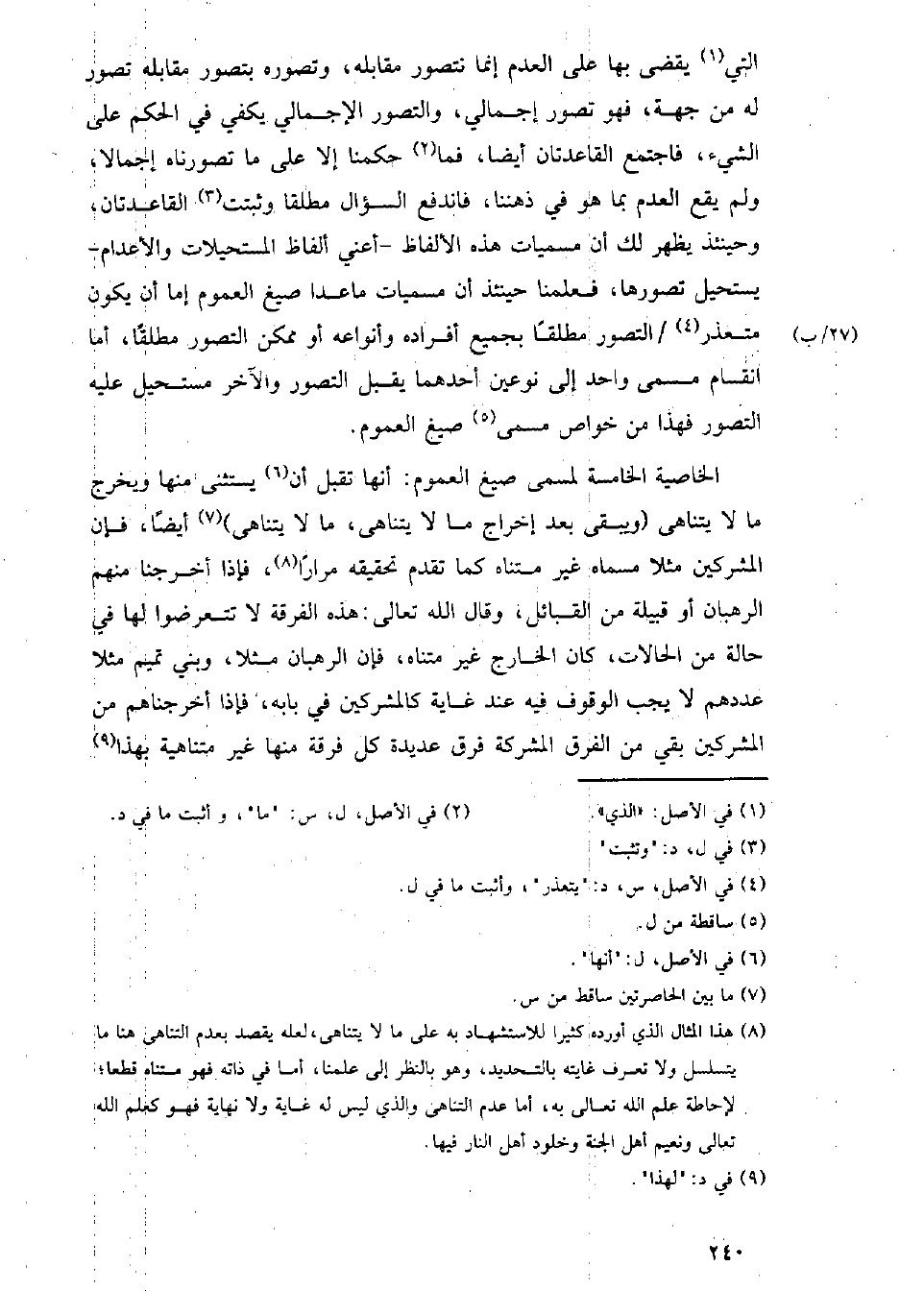 الخاصية الخامسة لمسمى صيغ العموم: أنها تقبل أن يستثنى منها ويخرج ما لا يتناهى (ويبقى بعد إخراج ما لا يتناهى) أيضا، فإن المشركين مثلا مسماه غير متناه، كما تقدم تحقيقه مرارا، فإذا أخرجنا منهم الرهبان أو قبيلة من القبائل، وقال الله تعالى: هذه الفرقة لا تتعرضوا لها في حالة من الحالات، كان الخارج غير متناه، فإن الرهبان مثلا، وبني تميم مثلا عددهم لا يجب الوقوف فيه عند غاية كالمشركين في بابه، فإذا أخرجناهم من المشركين بقي من الفرق المشركة فرق عديدة كل فرقة منها غير متناهية بهذا