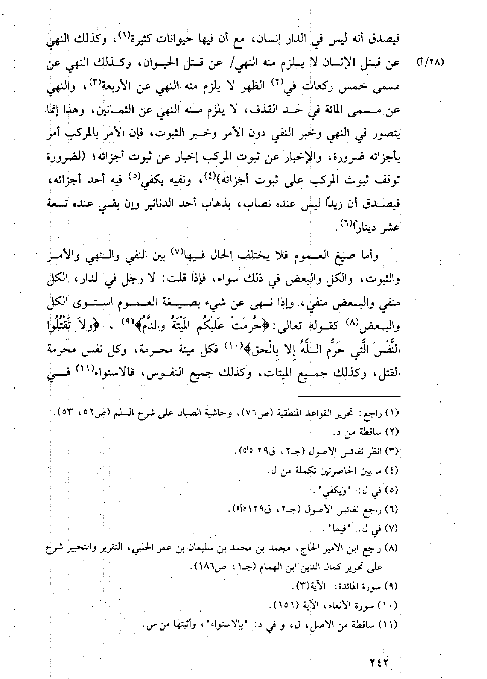 وأما صيغ العموم فلا يختلف الحال فيها بين النفي والنهي والأمر والثبوت، والكل والبعض في ذلك سواء، فإذا قلت: لا رجل في الدار، الكل منفي والبعض منفي، وإذا نهى عن شيء بصيغة العموم استوى الكل والبعض كقوله تعالى: {حرمت عليكم الميتة والدم}، {ولا تقتلوا النفس التي حرم الله إلا بالحق} فكل ميتة محرمة، وكل نفس محرمة القتل، وكذلك جميع الميتات، وكذلك جميع النفوس، فالاستواء في