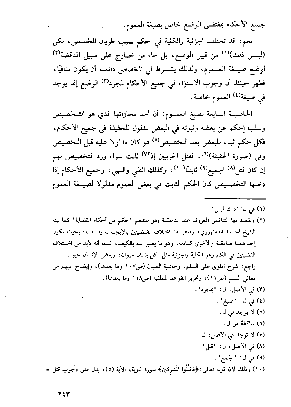 الخاصية السابعة لصيغ العموم: أن أحد مجازاتها الذي هو التخصيص وسلب الحكم عن بعضه وثبوته في البعض مدلول للحقيقة في جميع الأحكام، فكل حكم ثبت للبعض بعد التخصيص هو كان مدلولا عليه قبل التخصيص وفي (صورة الحقيقة)، فقتل الحربين إذا ثابت سواء ورد التخصيص بهم وفي (صورة الحقيقة)، فقتل الحربين إذا ثابت سواء ورد التخصيص بهم إن كان قتل الجميع ثابتا، وكذلك النفي والنهي، وجميع الأحكام إذا دخلها التخصيص كان الحكم الثابت في بعض العموم مدلولا لصيغة العموم