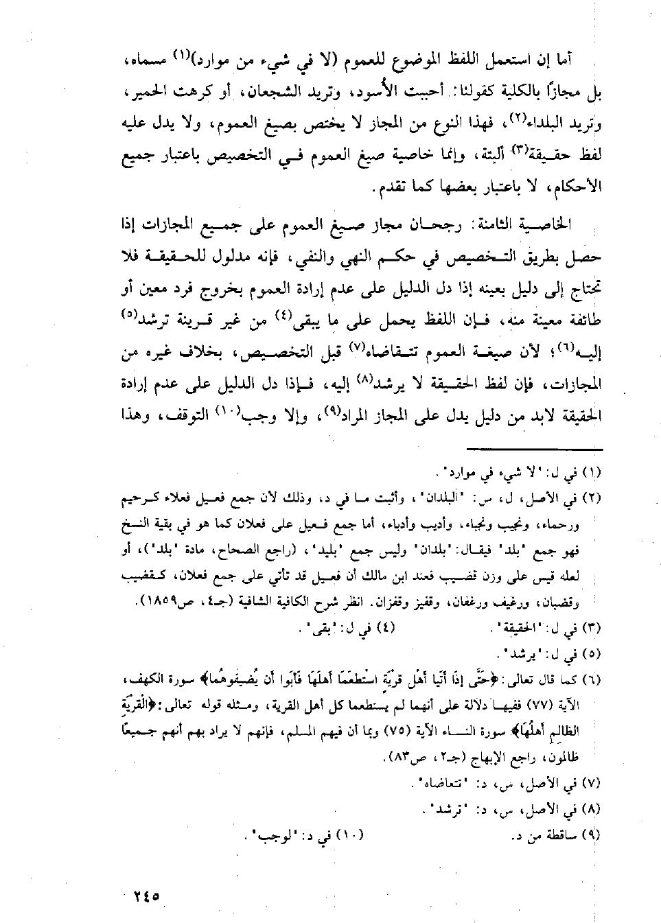 الخاصية الثامنة: رجحان مجاز صيغ العموم على جميع المجازات إذا حصل بطريق التخصيص في حكم النهي والنفي، فإنه مدلول للحقيقة فلا تحتاج إلى دليل بعينه إذا دل الدليل على عدم إرادة العموم بخروج فرد معين أو طائفة معينة منه، فإن اللفظ يحمل على ما يبقى من غير قرينة ترشد إليه؛ لأن صيغة العموم تتقاضاه قبل التخصيص، بخلاف غيره من المجازات، فإن لفظ الحقيقة لا يرشد إليه، فإذا دل الدليل على عدم إرادة الحقيقة لا بد من دليل يدل على المجاز المراد، وإلا وجب التوقف، وهذا