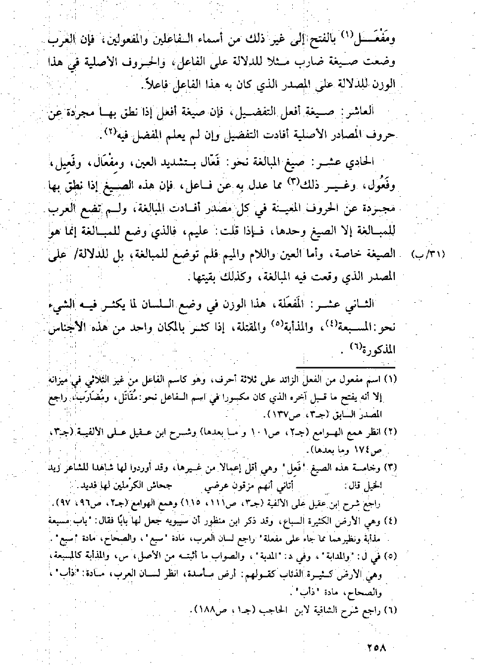 الثاني عشر: المفعلة، هذا الوزن في وضع اللسان لما يكثر فيه الشيء نحو: المسبعة، والمذأبة والمقتلة، إذا كثر بالمكان واحد من هذه الأجناس المذكورة.
