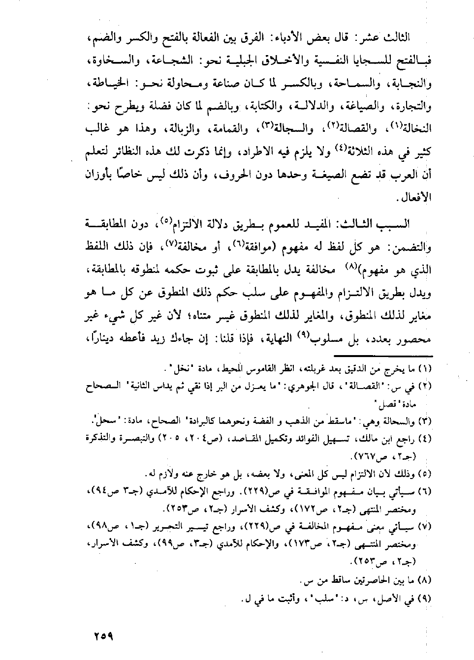 الثالث عشر: قال بعض الأدباء: الفرق بين الفعالة بالفتح والكسر والضم، فبالفتح للسجايا النفسية والأخلاق الجبلية نحو: الشجاعة، والسخاوة، والنجابة، والسماحة، وبالكسر لما كان صناعة ومحاولة نحو: الخياطة، والتجارة، والصياغة، والدلالة، والكتابة، وبالضم لما كان فضلة ويطرح نحو: النخالة، والقصالة، والسجالة، والقمامة، والزبالة، وهذا هو غالب كثير في هذه الثلاثة ولا يلزم فيه الاطراد، وإنما ذكرت لك هذه النظائر لتعلم أن العرب قد تضع الصيغة وحدها دون الحروف، وأن ذلك ليس خاصا بأوزان الأفعال.