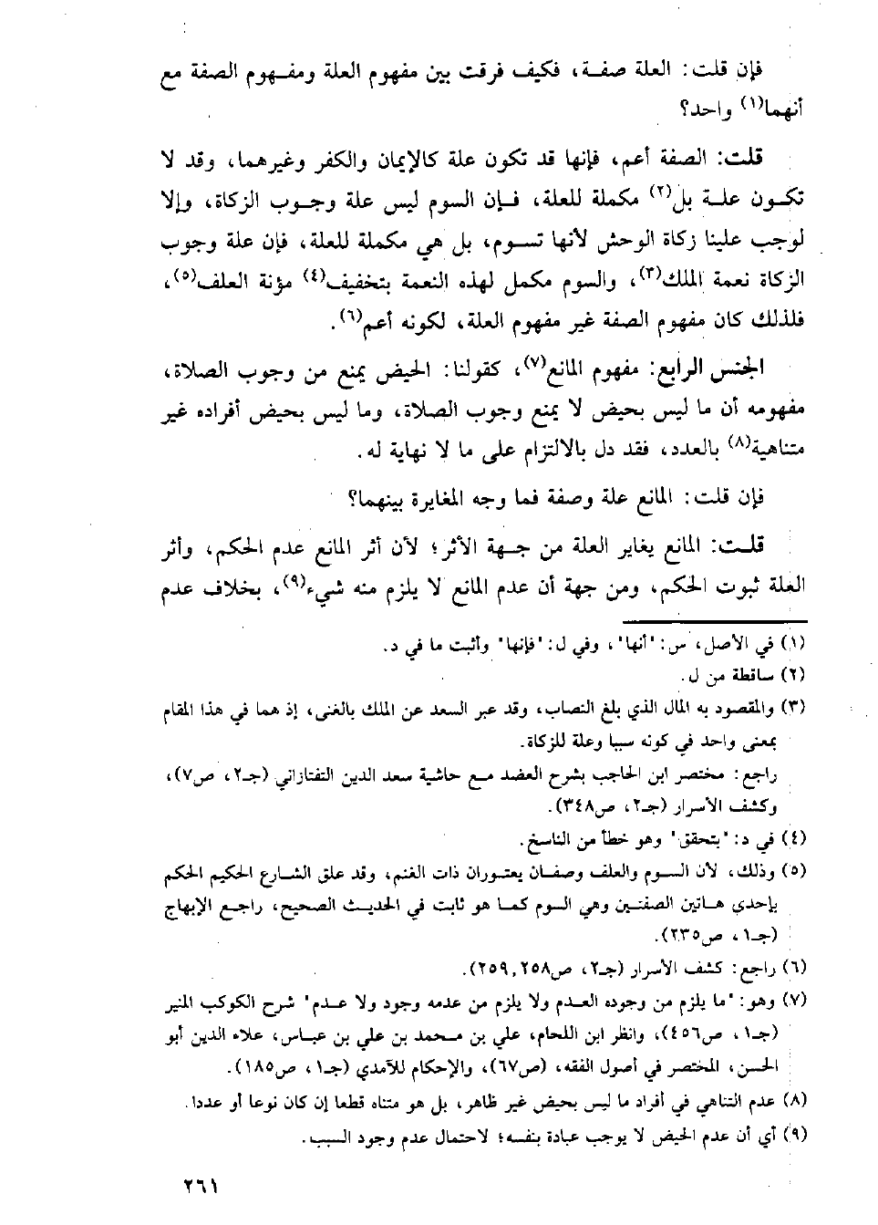 قلت: الصفة أعم، فإنها قد تكون علة كالإيمان والكفر وغيرهما، وقد لا تكون علة بل مكملة للعلة، فإن السوم ليس علة وجوب الزكاة، وإلا لوجب علينا زكاة الوحش لأنها تسوم، بل هي مكملة للعلة، فإن علة وجوب الزكاة نعمة الملك، والسوم مكمل لهذه النعمة بتخفيف مؤنة العلف، فلذلك كان مفهوم الصفة غير مفهوم العلة، لكونه أعم.