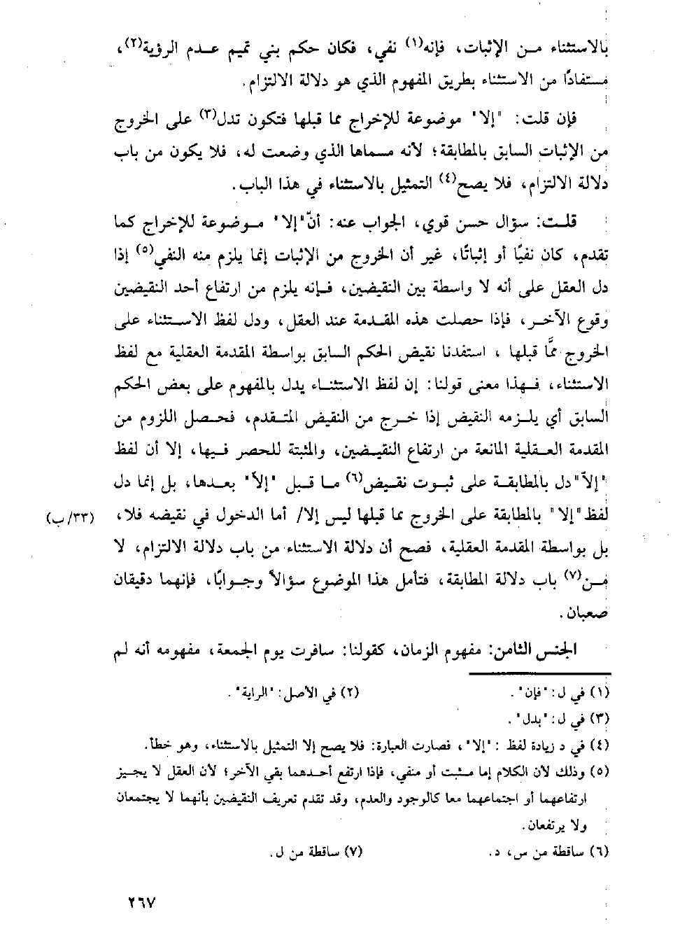 قلت: سؤال حسن قوي، الجواب عنه: أن (إلا) موضوعة للإخراج كما تقدم، كان نفيا أو إثباتا، غير أن الخروج من الإثبات إنما يلزم منه النفي إذا دل العقل على أنه لا واسطة بين النقيضين، فإنه يلزم من ارتفاع أحد النقيضين وقوع الآخر، فإذا حصلت هذه المقدمة عند العقل، ودل لفظ الاستثناء على الخروج مما قبلها، استفدنا نقيض الحكم السابق بواسطة المقدمة العقلية مع لفظ الاستثناء، فهذا معنى قولنا: إن لفظ الاستثناء يدل بالمفهوم على بعض الحكم السابق أي يلزمه النقيض إذا خرج من النقيض المتقدم، فحصل اللزوم من المقدمة العقلية المانعة من ارتفاع النقيضين، والمثبتة للحصر فيها، إلا أن لفظ (إلا) دل بالمطابقة على ثبوت نقيض ما قبل (إلا) بعدها، بل إنما دل لفظ (إلا) بالمطابقة على الخروج مما قبلها ليس إلا/ أما الدخول في نقيضه فلا، بل بواسطة المقدمة العقلية، فصح أن دلالة الاستثناء من باب دلالة الالتزام، لا من باب دلالة المطابقة، فتأمل هذا الموضوع سؤال وجوابا، فإنهما دقيقان صعبان.