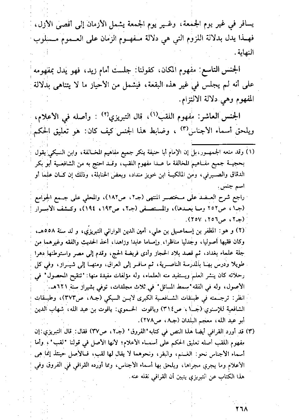 الجنس التاسع: مفهوم المكان، كقولنا: جلست أمام زيد، فهو يدل بمفهومه على أنه لم يجلس في غير هذه البقعة، فيشمل من الأحياز ما لا يتناهى بدلالة المفهوم وهي دلالة الالتزام.