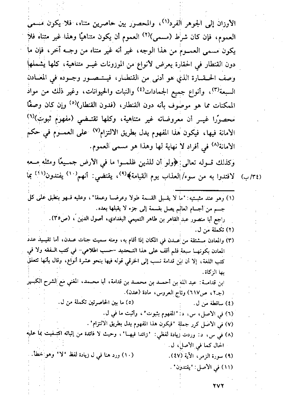 الأوزان إلى الجوهر الفرد، والمحصور بين حاصرين متناهن فلا يكون مسمى العموم، فإن كان شرط (مسمى) العموم أن يكون متناهيا وهذا غير متناه فلا يكون مسمى العموم من هذا الوجه، غير أنه غير متناه من وجه آخر، فإن ما دون القنطار في الحقارة يعرض لأنواع من الموزونات غير متناهية، كلها يشملها وصف الحقارة الذي هو أدنى من القنطار، فيتصور وجوده في المعادن السبعة، وأنواع جميع الجمادات والنبات والحيوانات، وغير ذلك من مواد الممكنات مما هو موصوف بأنه دون القنطار، (فدون القنطار) وإن كان وصفا محصورا غير أن معروضاته غير متناهية، وكلها تقتضي (مفهوم ثبوت) الأمانة فيها، فيكون هذا المفهوم يدل بطريقة الالتزام على العموم في حكم الأمانة في أفراد لا نهاية لها وهذا هو مسمى العموم.