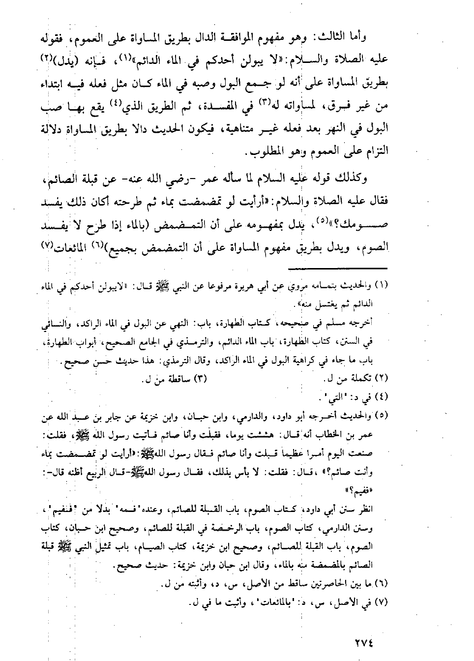 وأما الثالث: وهو مفهوم الموافقة الدال بطريق المساواة على العموم، فقوله عليه الصلاة والسلام: (لا يبولن أحدكم في الماء الدائم)، فإنه (يدل) بطريق المساواة على أنه لو جمع البول وصبه في الماء كان مثل فعله فيه ابتداء من غير فرق، لمساواته له في المفسدة، ثم الطريق الذي يقع بها صب البول في النهر بعد فعله غير متناهية، فيكون الحديث دالا بطريق المساواة دلالة التزام على العموم وهو المطلوب.