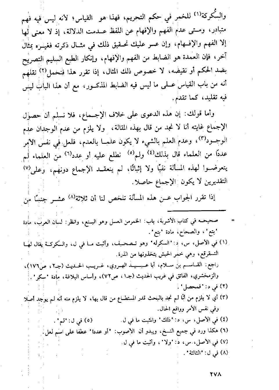 والسكركة للخمر في حكم التحريم، فهذا هو القياس؛ لأنه ليس فيه فهم متبادر، ومتى عدم الفهم عن اللفظ عدمت الدلالة، إذ لا معنى لها إلا الفهم والإفهام، وإن عسر عليك تحقيق ذلك في مثال ذكرته فغيره بمثال آخر، فإن العمدة هو الضابط من الفهم والإفهام، وإنكار الطبع السليم التصريح بضد الحكم أو نقيضه، لا خصوص ذلك المثال، إذا تقرر هذا فنحمل نقلهم أنه من باب القياس على ما ليس فيه الضابط المذكور، مع إن هذا الباب ليس فيه تقليد، كما تقدم.