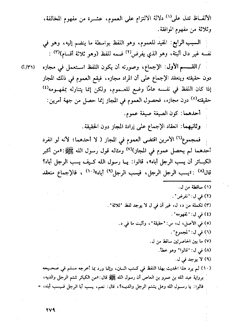فمجموع الأمرين اقتضى العموم في المجاز (لا أحدهما؛ لأنه لو انفرد أحدهما لم يحصل عموم في المجاز) ومثاله قول رسول الله - صلى الله عليه وسلم -: (من أكبر الكبائر أن يسب الرجل أباه)، قالوا: يا رسول الله كيف يسب الرجل أباه؟ قال: (يسب الرجل الرجل، فيسب الرجل أباه)، فالإجماع منعقد
