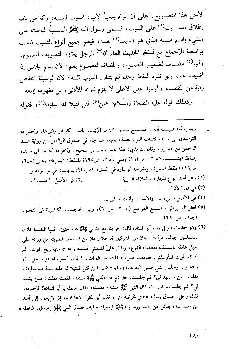 لأجل هذا التصريح، على أن المراد بسب الأب: السبب لسبه، وأنه من باب إطلاق المسبب على السبب، فسمى رسول الله - صلى الله عليه وسلم - السبب الباعث على الشيء باسم مسببه الذي هو السبب نفسه، فيعم جميع أنواع التسبب لسب بواسطة الإجماع مع لفظ الحديث العام أن الرجل يلازم التعريف للعموم، وأب مضاف لضمير العموم، والمضاف للعموم يعم؛ لأن اسم الجنس إذا أضيف عم، ولو انفرد اللفظ وحده لم يتناول السبب ألبتة؛ لأن الوسيلة أخفض رتبة من المقصد، والوعيد على الأعلى لا يلزم ثبوته للأدنى، بل مفهومه يمنعه.